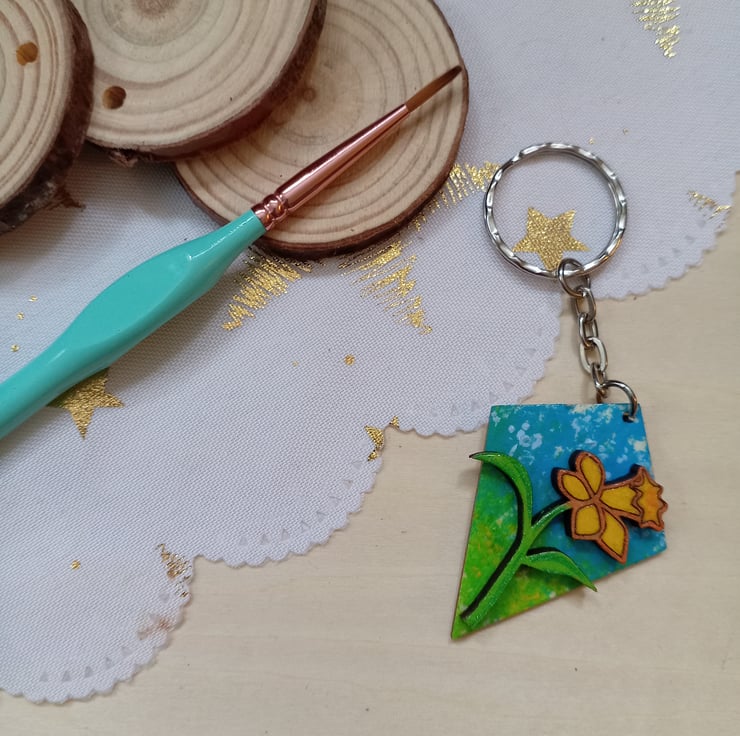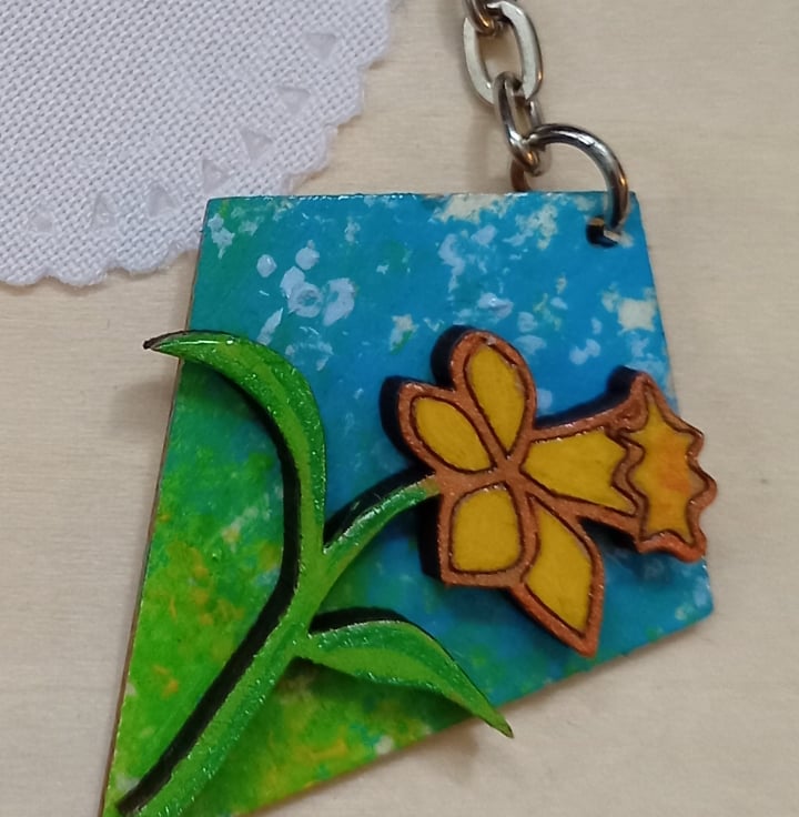 A 4cm x 6cm wooden kite shaped keyring that has been hand painted with a sky and grass background and a raised daffodil detail