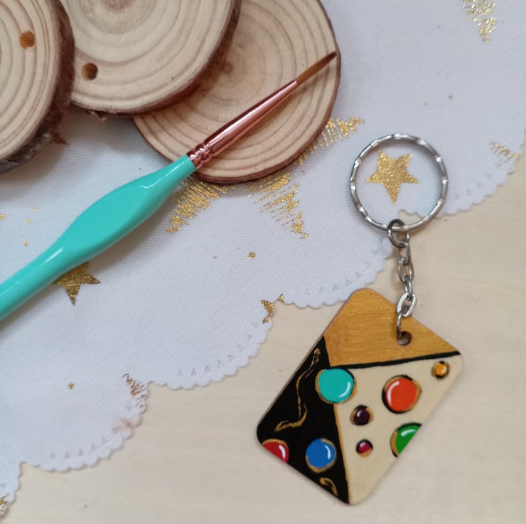 A 3cm x 4cm wooden rectangular keyring with a hand painted bubble pattern in bright colours and a gold and black background