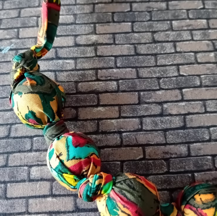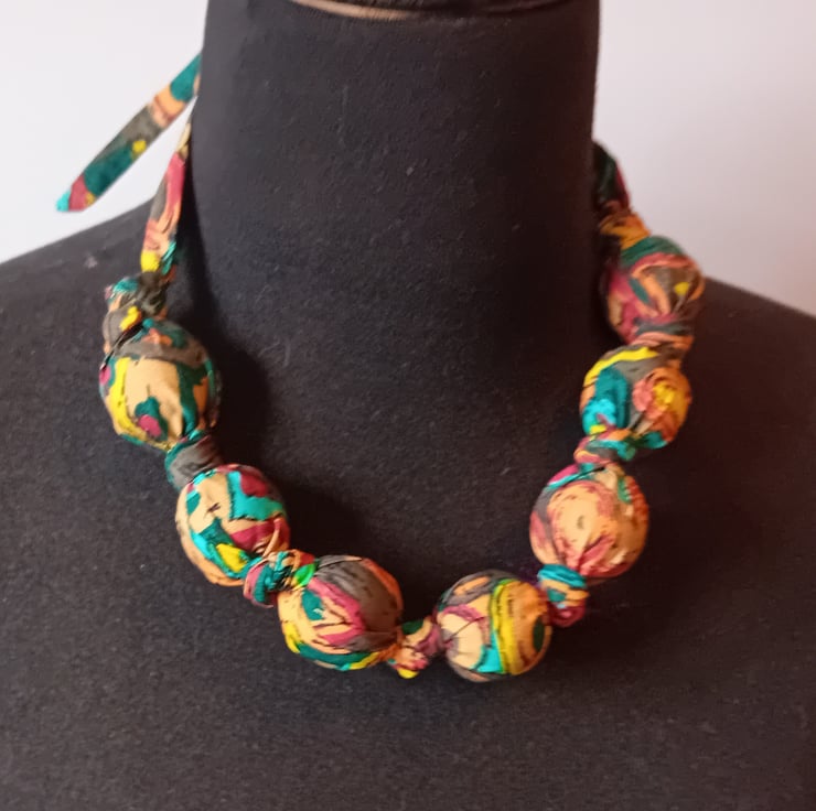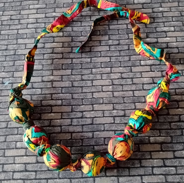 We have lots of vintage headscarfs and sari fabrics all vibrant and intersting colours. And love repurposing charity shop finds, bead necklaces being one of our favourites. Combining the two produces these amazing necklaces.
