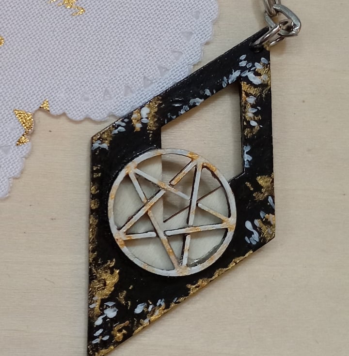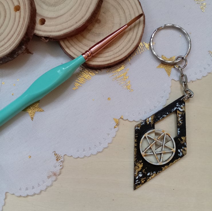A 7cm x 4cm wooden diamond shaped Keyring featuring a cut out centre hand painted in a simple black and gold background with a raised pentagram detail