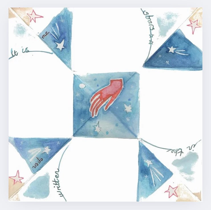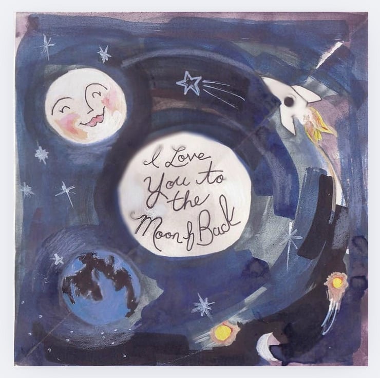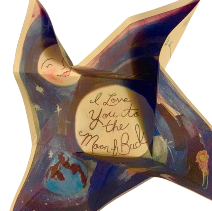 Made from hand illustrated print on scrap paper and into folded puzzle gift box. Illustration inside says “love you to the moon and back”