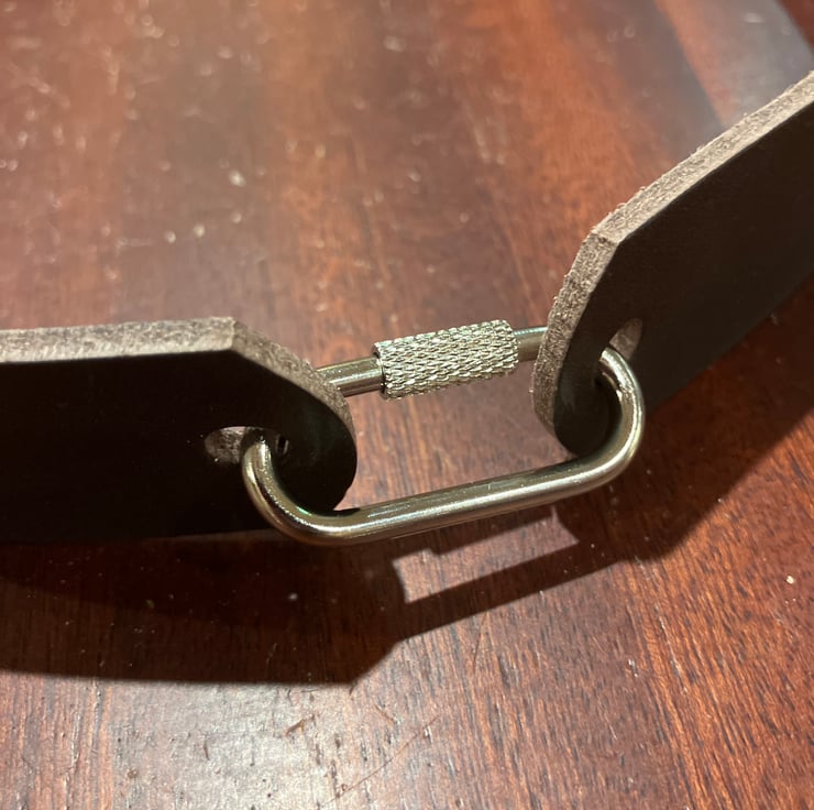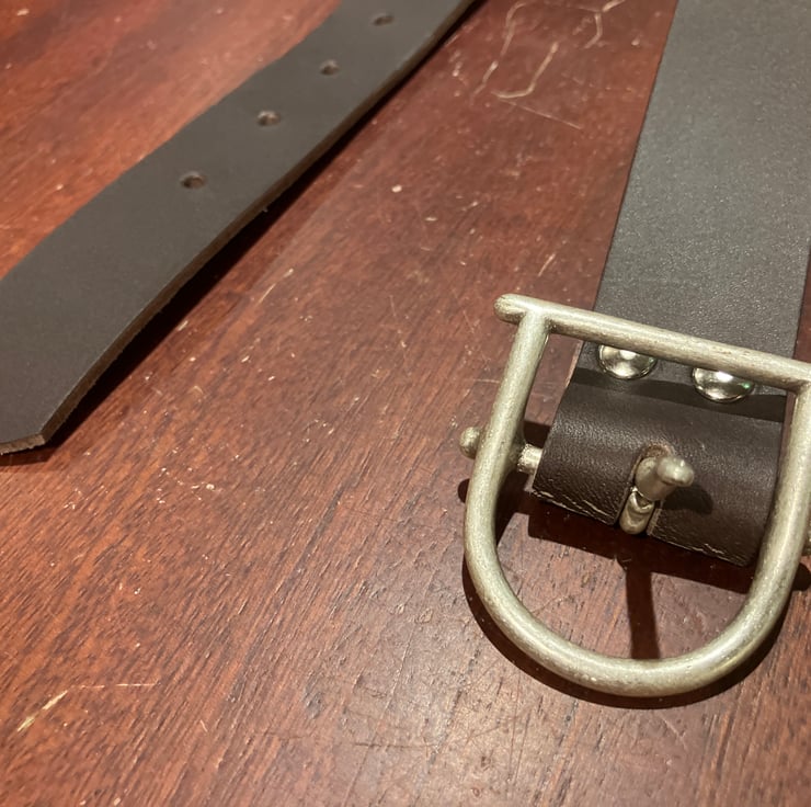 The 2 leather pieces that form the belt are connected with 1 locking chain link (see photos). Leather weight is a firm 3-4 oz. Buckle is held in place with 2 rivets.