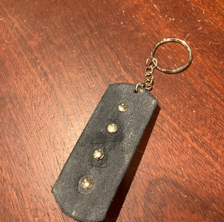 There are also 3 Orange Gemstones riveted onto the leather shape.