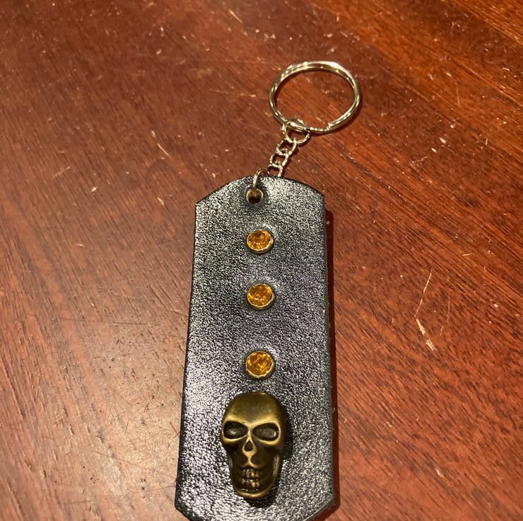 Black dyed Leather Keyring with 3 Orange Gemstones & Skull Head - FREE SHIPPING