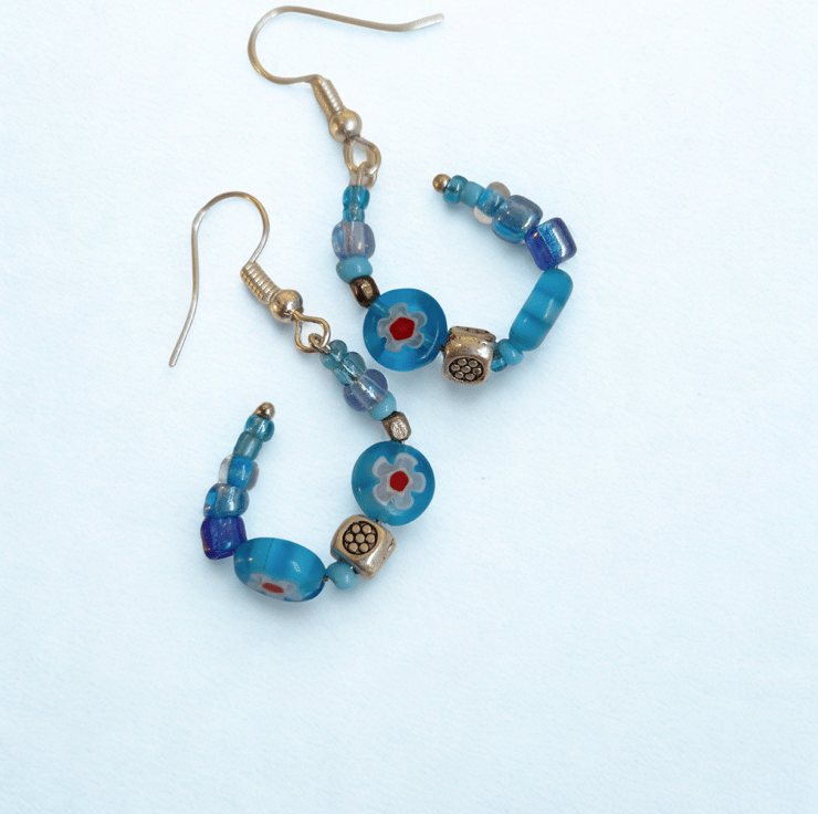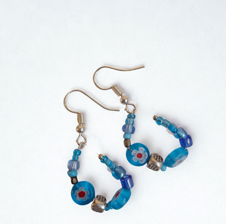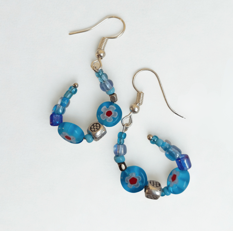 Beautiful blues! Glass beads, tiny beads combined with little cubes of Tibetan silver and very pretty round Murano glass beads. Curved into almost hoops and hanging on nickel free 925 silver hooks.