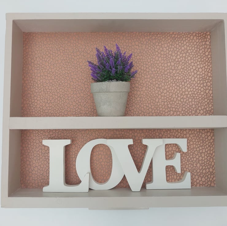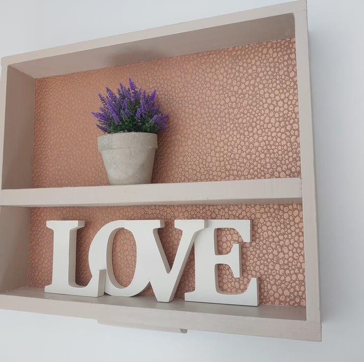 This upcycled drawer wall hanging shelf has copper effect paper background and has been painted in a warm clay satin furniture paint.
