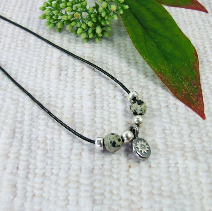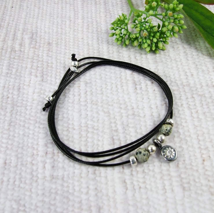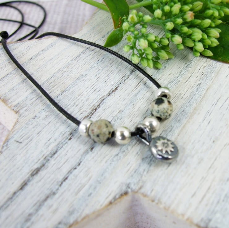 Sunflower Pebble Necklace, Sterling Silver with Sesame Jasper on an adjustable wax cord, with sterling silver sliding clasp. Can also be worn as a wrap bracelet