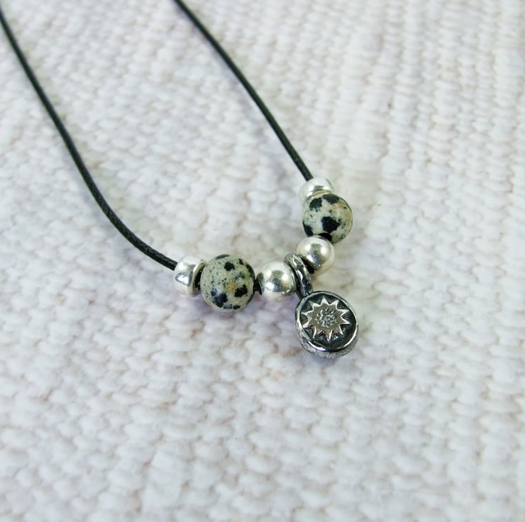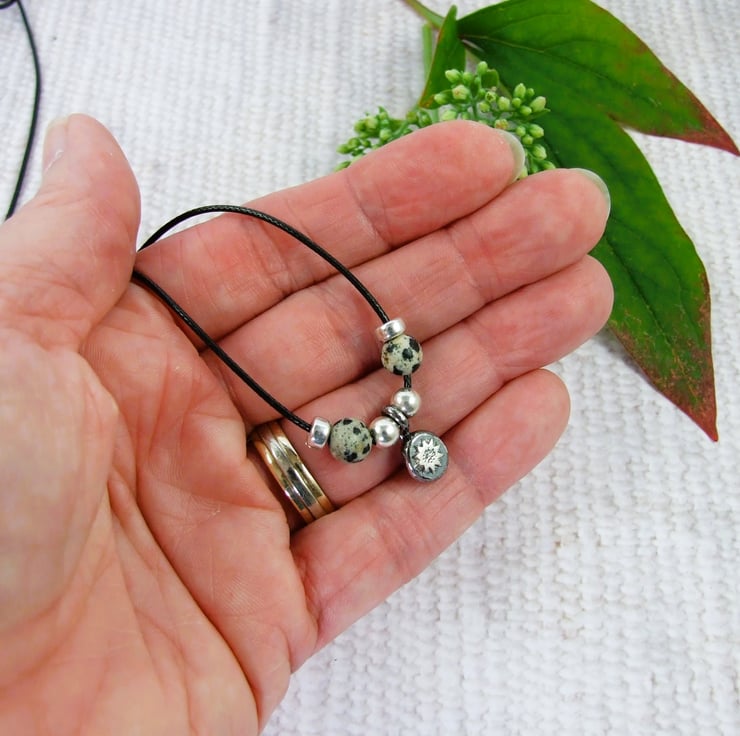 I have created the sunflower pebble from molten sterling silver, heated to melting point where it forms a small pebble, then hammered to flatten and added a little sunflower motif. I textured the sunflower and added the hanging loop. This is paired with silver beads and 6mm sesame jasper gemstone beads. Suspended from 1mm black waxed cord which I have fitted with a sliding silver clasp. Small silver beads have been added to the end of the cord. Necklace is put on over the head and can be worn at any length to 30 inches or wrapped around your wrist to wear as a bracelet.