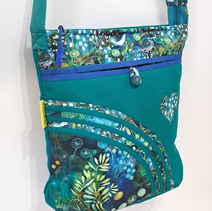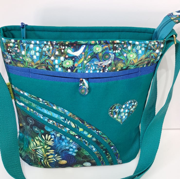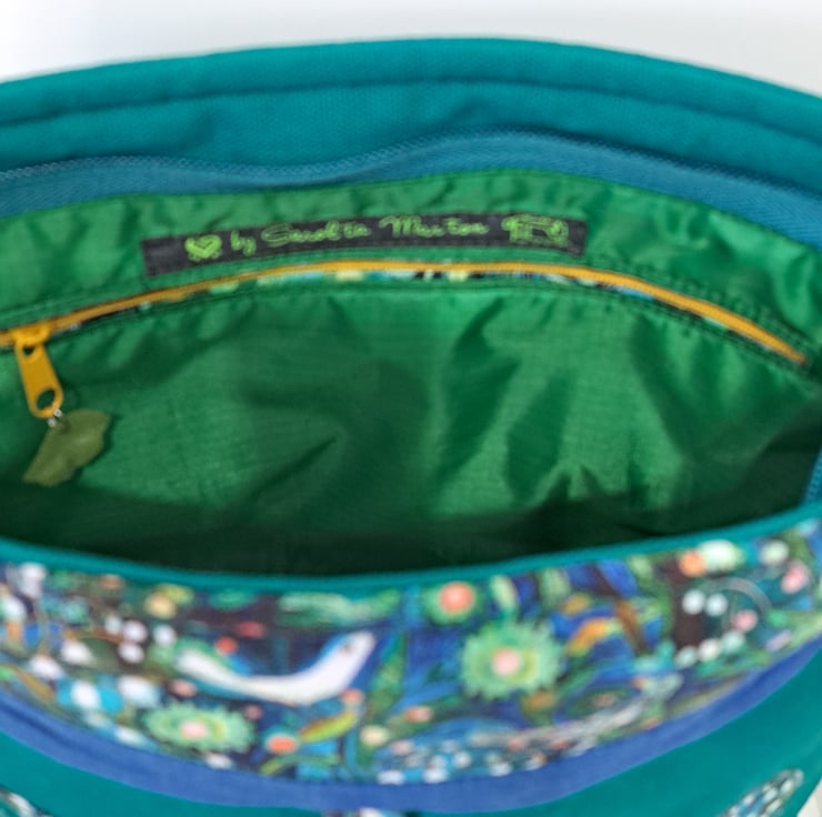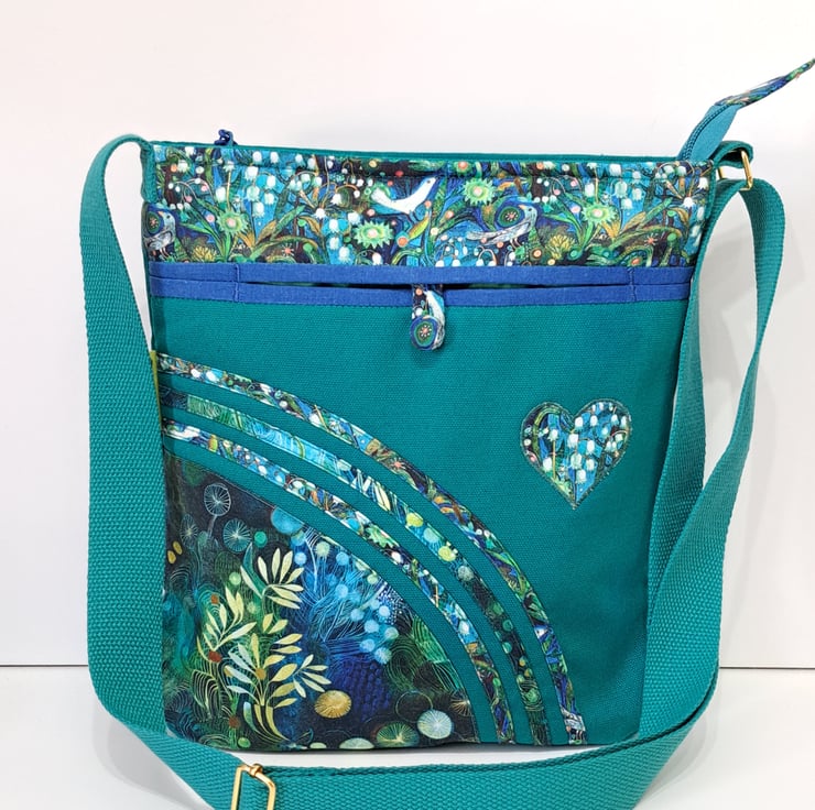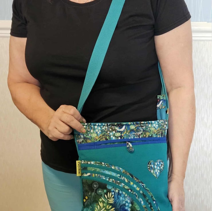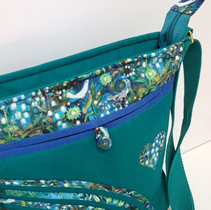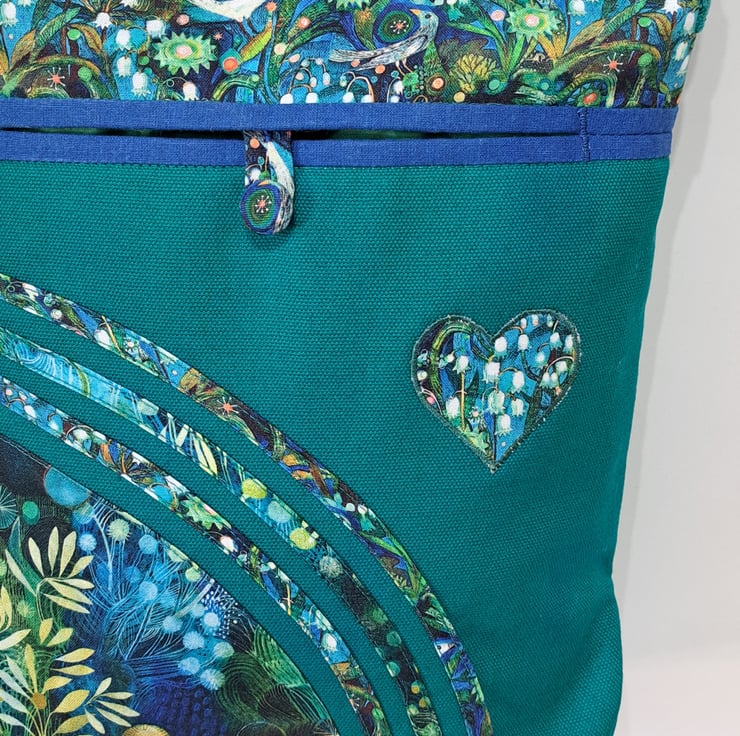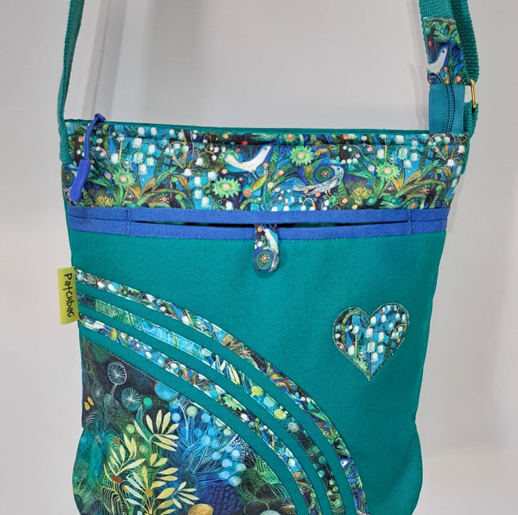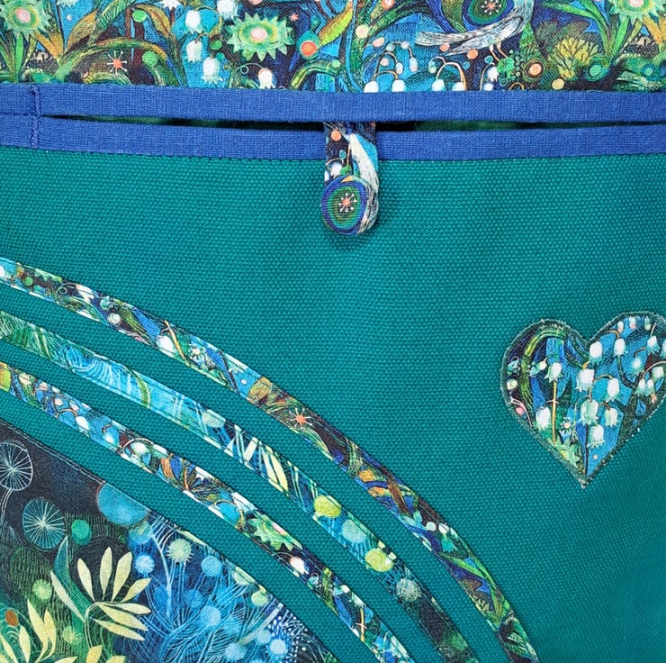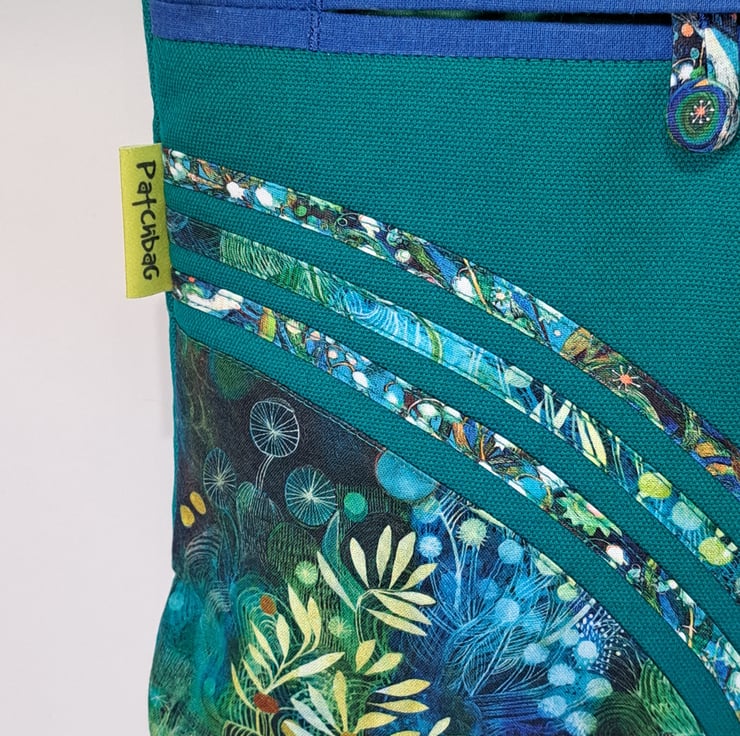 The main fabric is green canvas,decorated with cotton fabrics. The pattern in different shades of green and turquoise. The lining made from waterproof fabric. The bag has inner pocket with zip closure with leaf charm on the zipper, and outside pocket with handmade covered button closure. The front big pocket big enough for a mobile phone or for your keys,so this very practical. The shoulder strap is adjustable with golden metal clasps, maximum length approximately 140cm, so can use as a crossbody bag as well. This is a lightweight handbag, ideal for holidays. The dimensions of the bag : hight 27cm, width 27cm, depth 8.5 cm on the bottom of the bag.