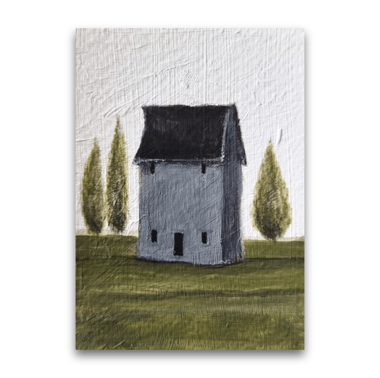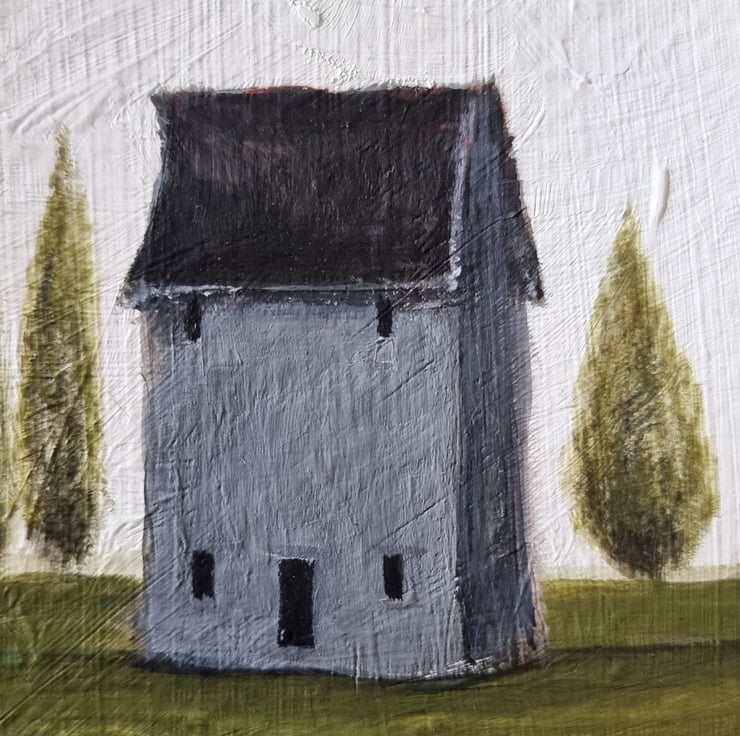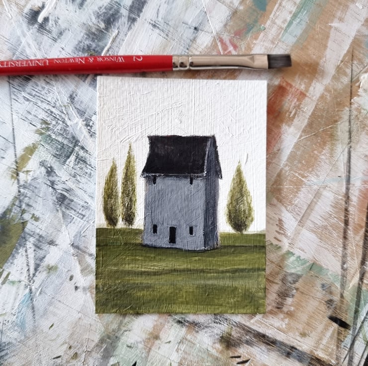 ACEO - A teeny tiny original one of a kind painting of a grey house with trees in a green field. This little artwork is painted on textured paper. ACEO's are about the size of an average playing card. They make sweet little collectables, unique gifts, stocking fillers etc and can be framed. Approx overall size - 2.5 x 3.5 inches.