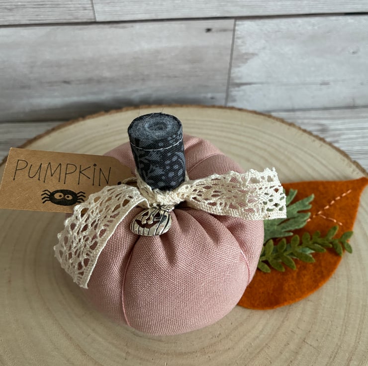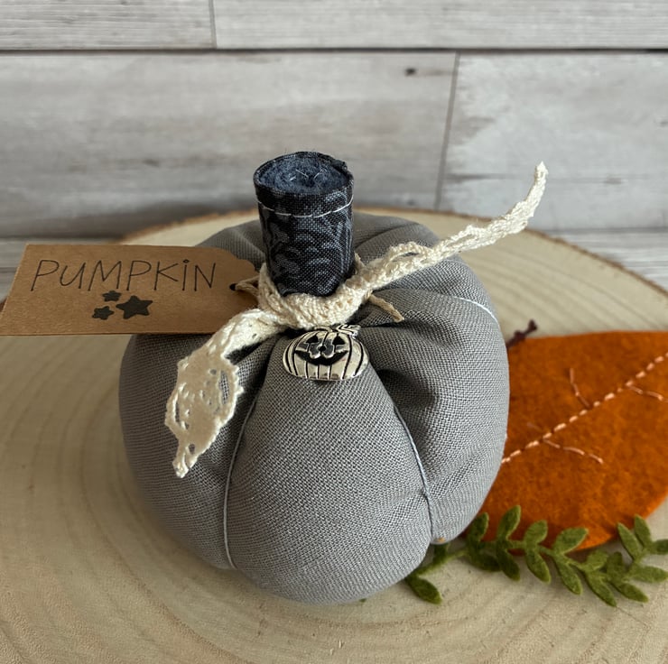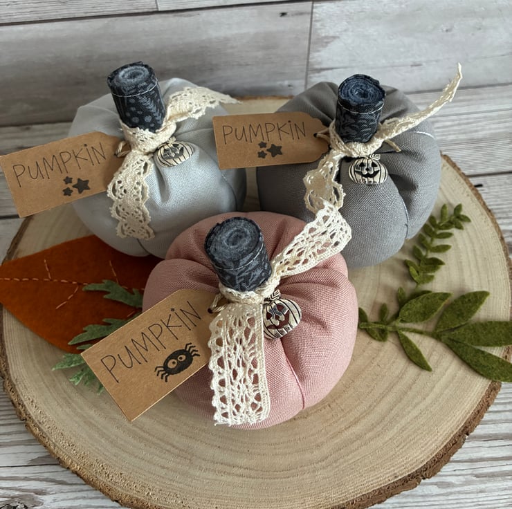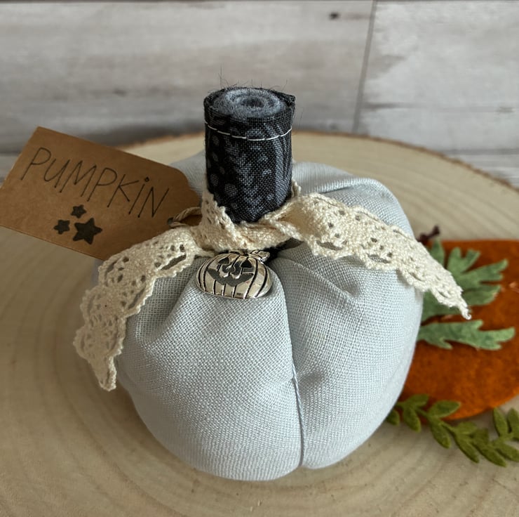 These lovely fabric pumpkins would make a lovely display for Autumn. They are made from linen fabric, with felt and fabric stalks. They are finished off with cream cotton lace and a little pumpkin silver coloured charm. Each one has a little pumpkin tag.