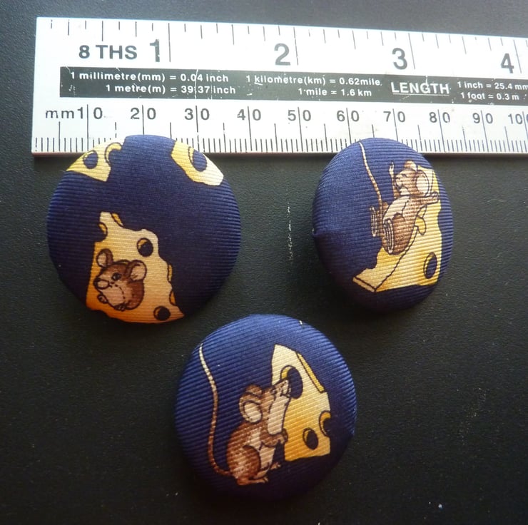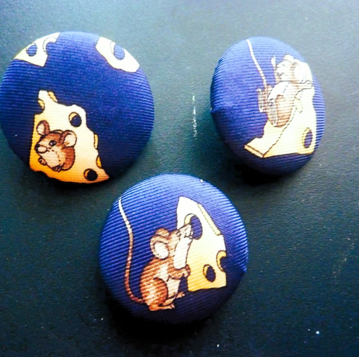 The product is a set of five unique handmade silk buttons featuring comic mice and cheese designs. sets of 5 are available. They are 3cm/1.25ins buttons are perfect for a variety of craft projects and will add a smile to a dreary day. Made from an upcycled vintage silk tie they are made by me and I have 6 sets of 5 buttons. As can be seen in pictures the mice are having fun in different ways and the set will have a mixture ofcavorting mouse poses. Add a touch of wimsy to any crafting project.