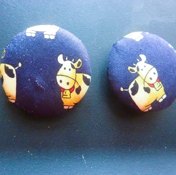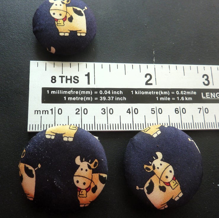 This product consists of a set of 5 handmade silk buttons featuring happy cows design, perfect for adding a unique touch to your upholstery, blazers, suits, jackets, or crafts projects. The buttons are 2.5cm/1 inch in size, round shape, with these 2-hole flat buttons are sure to add a touch of charm and creativity to your creations.