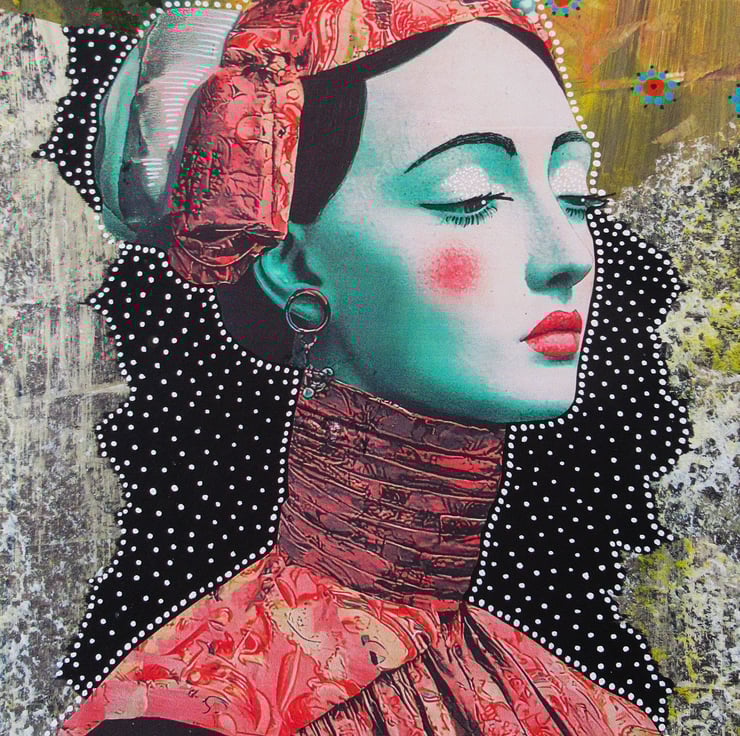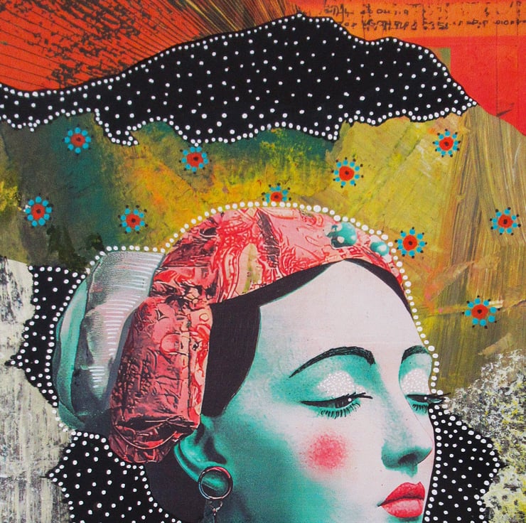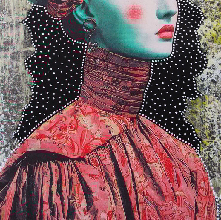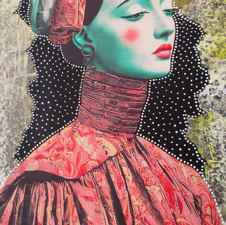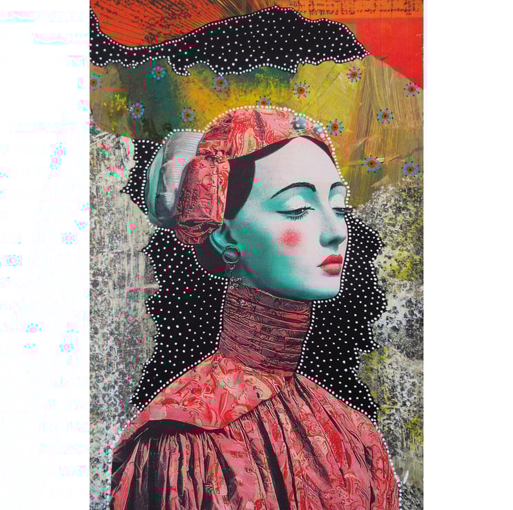 Transform your interior space with this beautiful and unique, whimsical / surreal art piece in acrylic, collage and drawing pens on 2mm board. Featuring a female figure adorned in salmon pink vintage inspired attire and a pale green shadowed face set against a spotted with bold geometric and floral accents. The contrasting colors and intricate details create a dreamy, avant-garde composition that’s perfect for lovers of modern art, surrealism, and eclectic décor. It measures 8 x 12 inches and will be hand signed by Bea on the front before shipping. Perfect for bohemian interiors, eclectic home décor, meditation spaces, or as a unique gift for art lovers. This piece adds mystery, elegance, and a pop of color to any contemporary interior. Make your walls as bold as your imagination!