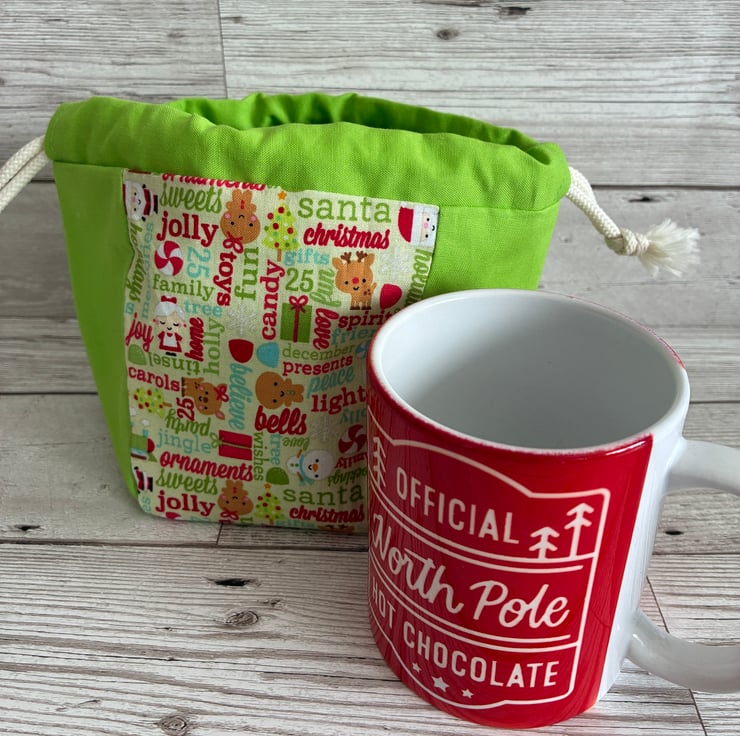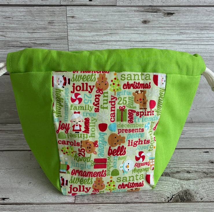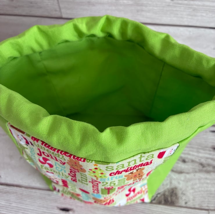 This cute gift bag can be used year after year - or re-gifted with little goodies. It was made from cotton fabric and is fully lined. The drawstring pulls it shut to stop peeking! The bag will fold flat for storing but is made in such a way that the base will pop out to give lots of space.