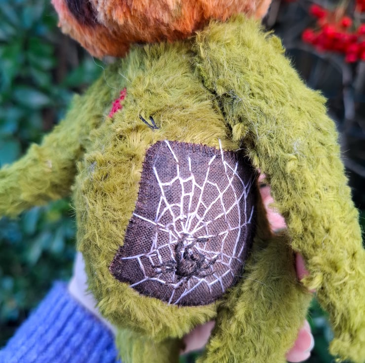 Another striking feature of hers is the grey patch on her belly, hand embroidered with a spider's web and spider on it. She has a small crochet heart sewn onto her as well, made from thin red embroidery thread.