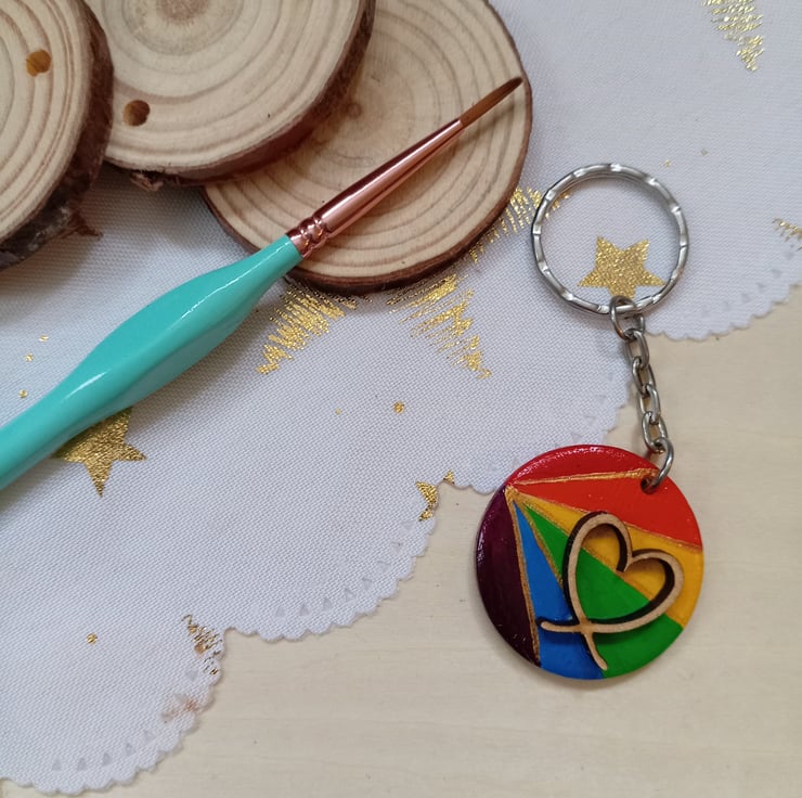 A 3cm round wooden keyring with a hand painted rainbow design in the pride colours featuring a raised wooden heart detail