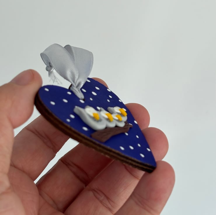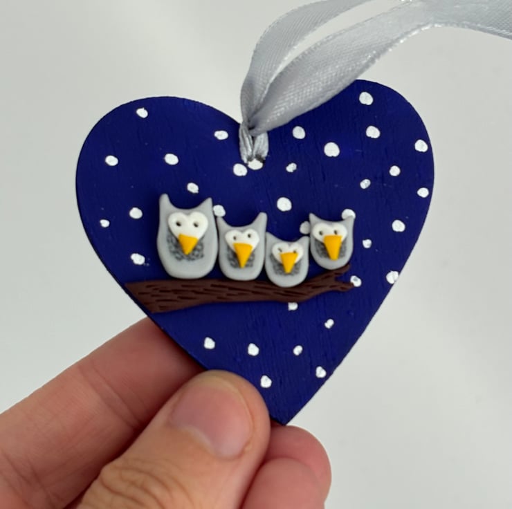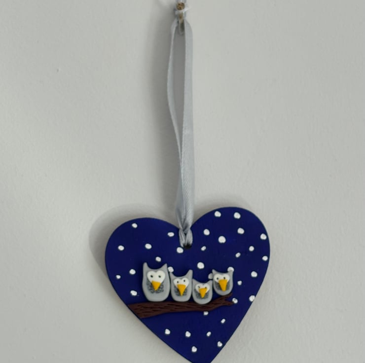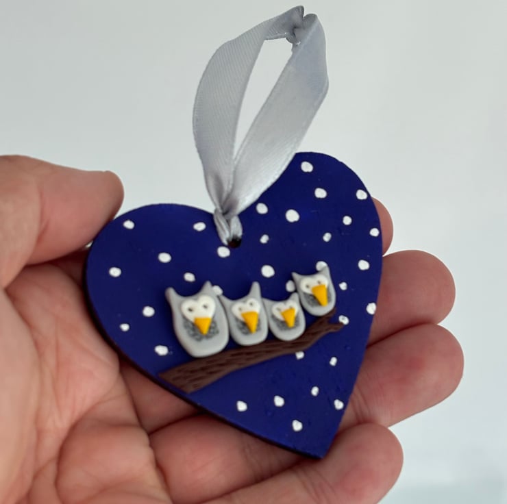 Charming heart-shaped wooden ornament featuring four cute owls perched on a branch. Handcrafted from polymer clay, painted deep blue with white polka dots, and finished with a grey ribbon for easy hanging. Perfect as a gift, keepsake, or unique home decoration.
