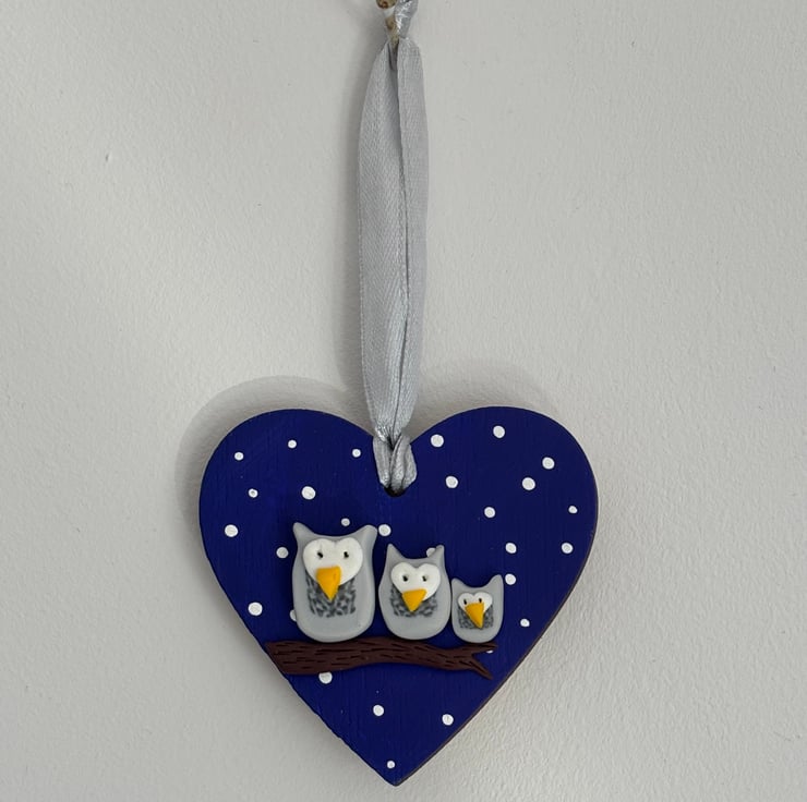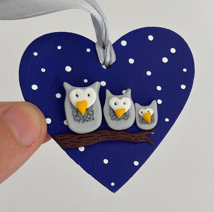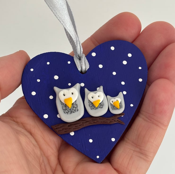 Charming heart-shaped wooden ornament featuring three cute owls perched on a branch. Handcrafted from polymer clay, painted deep blue with white polka dots, and finished with a grey ribbon for easy hanging. Perfect as a gift, keepsake, or unique home decoration.