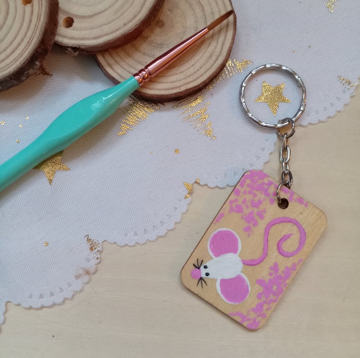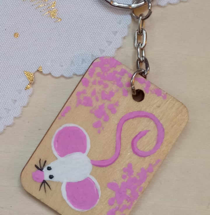 A 3cm x 4cm wooden rectangular keyring with a hand painted white and pink mouse design