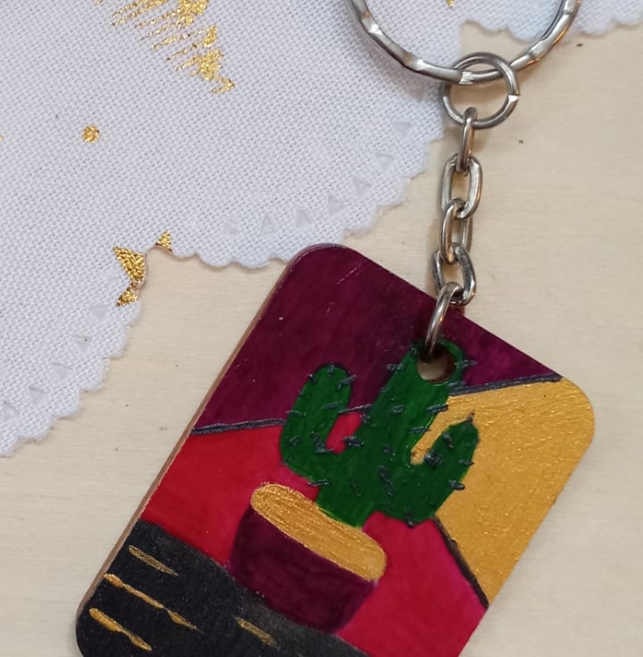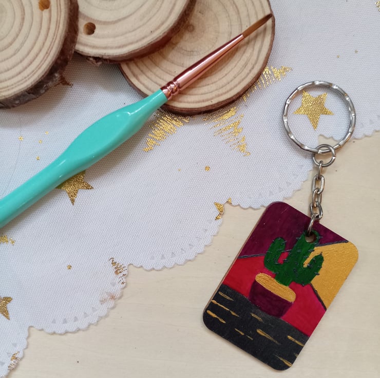 A 3cm x 4cm wooden rectangular keyring with a hand painted cactus design featuring a purple, pink and gold background