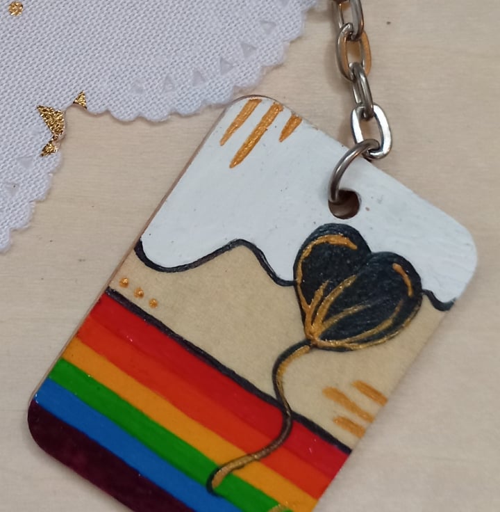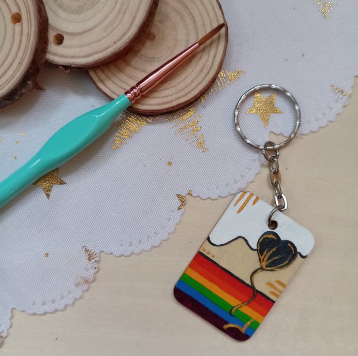 A 3cm x 4cm wooden rectangular keyring with a hand painted heart shaped balloon and a pride coloured rainbow pattern