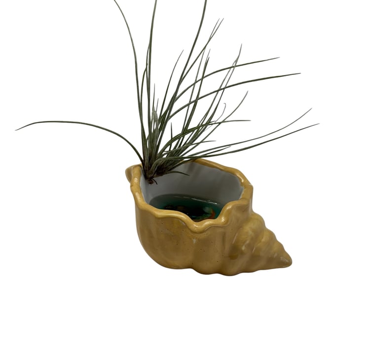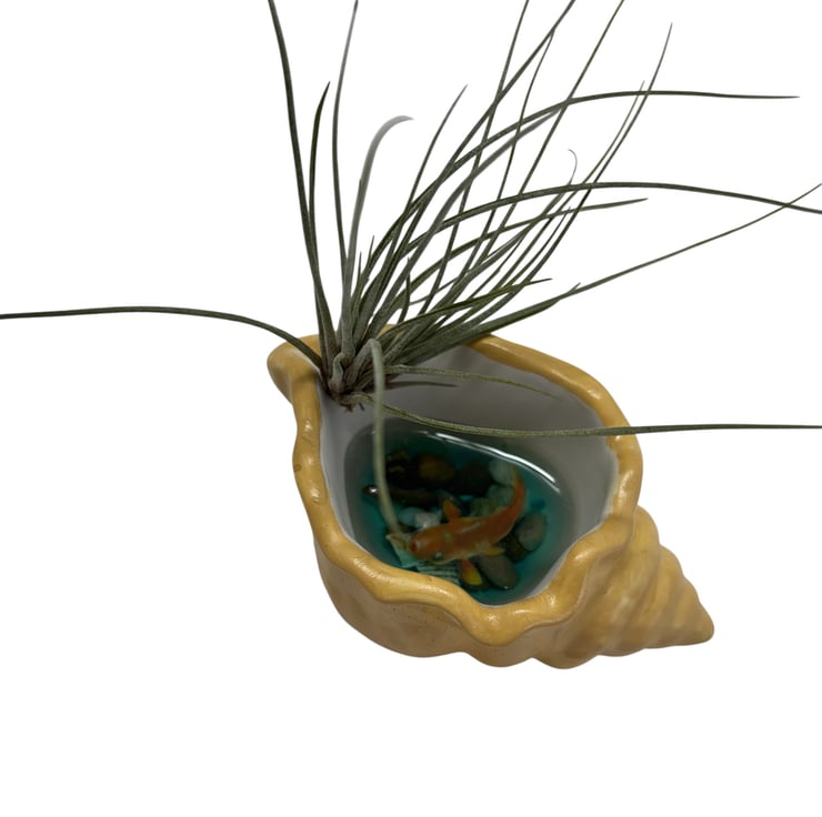 Inspired by the tranquility of Koi ponds and the magic of the ocean, this design blends land and sea. The seashell represents nature's beauty, the koi symbolises luck and prosperity, and the air plant brings living energy- together creating a miniature world full of peace and charm