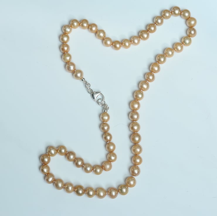 A delightful gift for someone special or a treat for yourself: beautiful freshwater pearls dyed a pretty light golden yellow shade, perfect with summer clothes or against a dark top. The pearls have some slight irregularities in size and are described as ‘near round’ by the supplier of the loose pearls. The close-up photos show the detail.