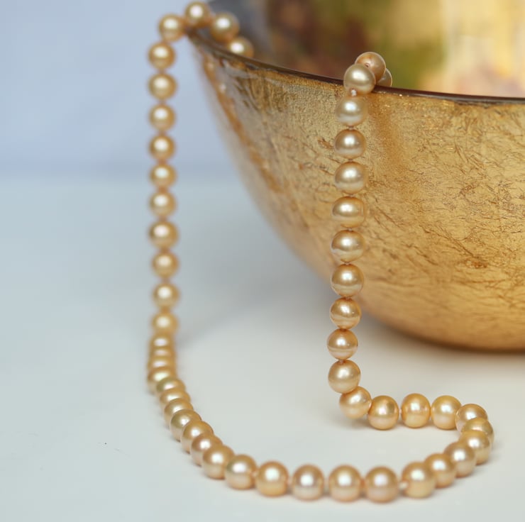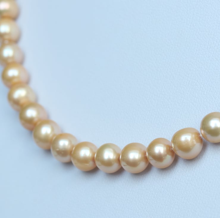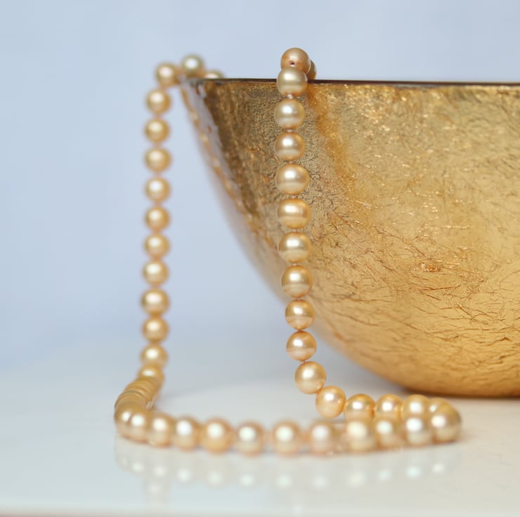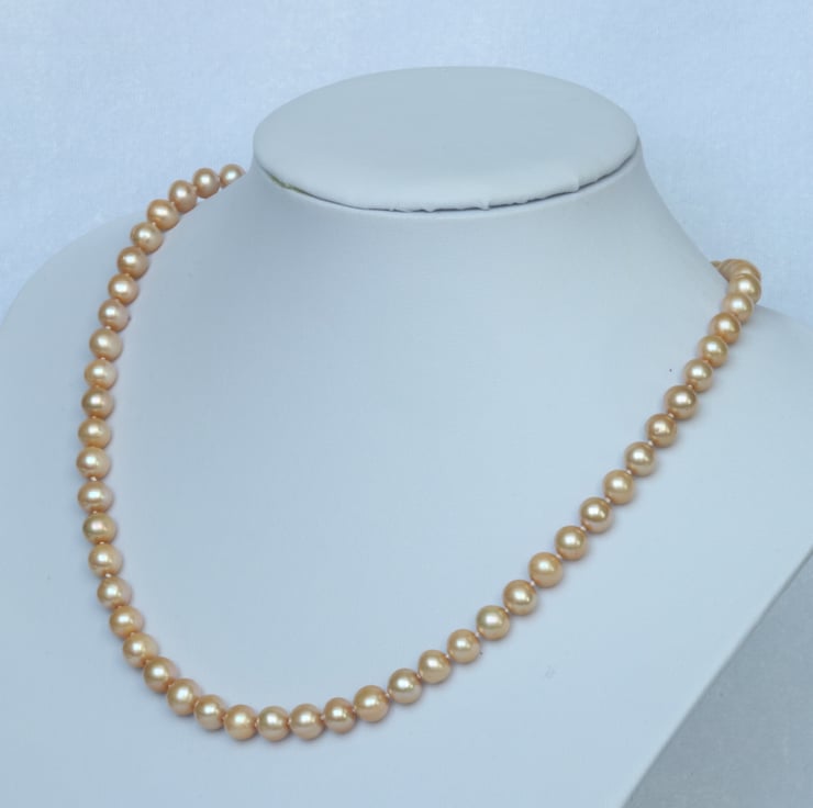 Each pearl is approximately 7-8mm in diameter. The surfaces are smooth with some minor flaws such as growth lines and blemishes. I have strung them on silk: the traditional medium, and have knotted between each pearl, a classic technique that ensures a good drape and also security in the unlikely event that the silk breaks.