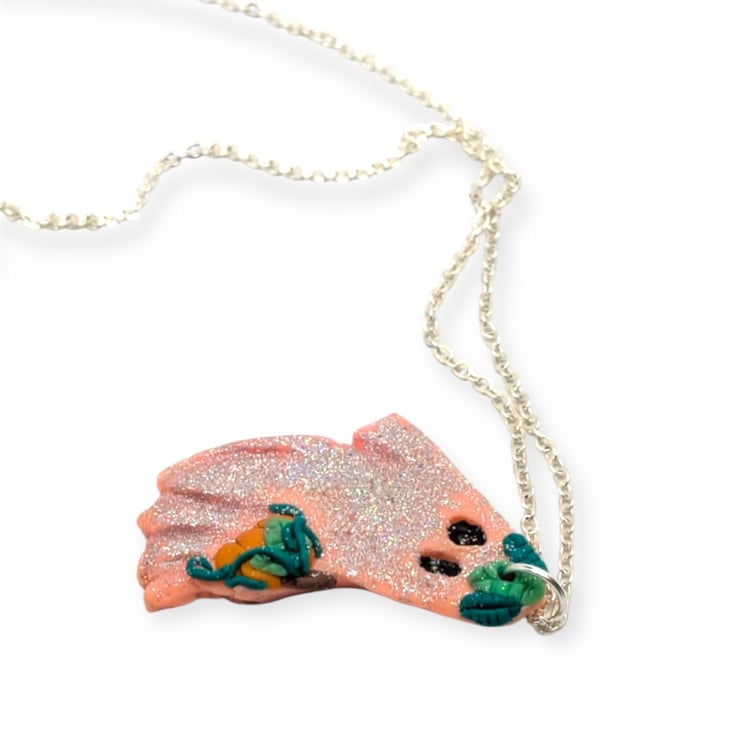 Add a sprinkle of spooky-sweet charm to your look with this handmade glittery pink ghost necklace!