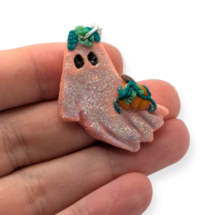 Crafted from polymer clay with a sparkling finish, this little ghost comes holding a cheerful pumpkin, making it the perfect accessory for Halloween lovers who like their spooky with a dash of cute.