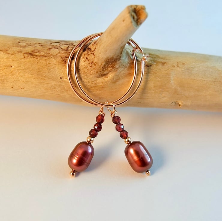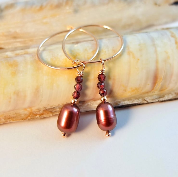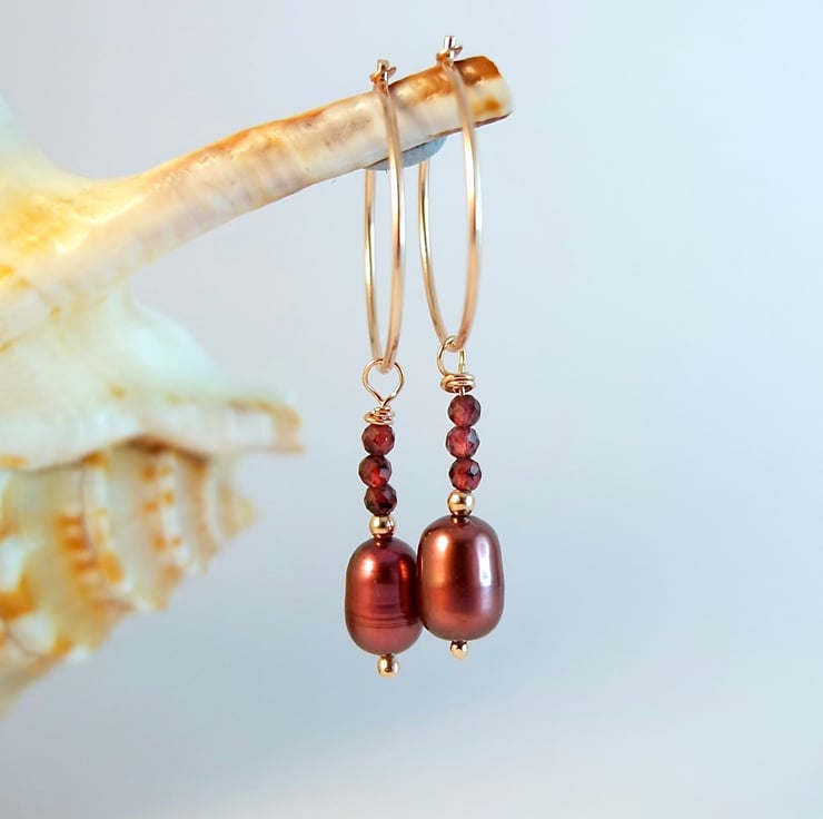 Each dainty little earring features an 8mm burgundy freshwater rice Pearl topped with a trio of 2mm faceted garnets.