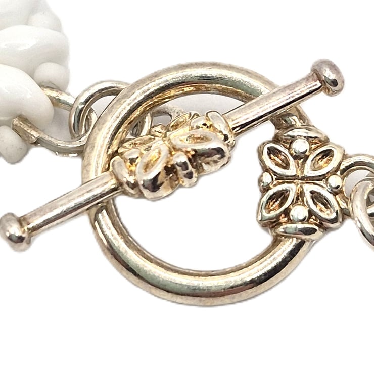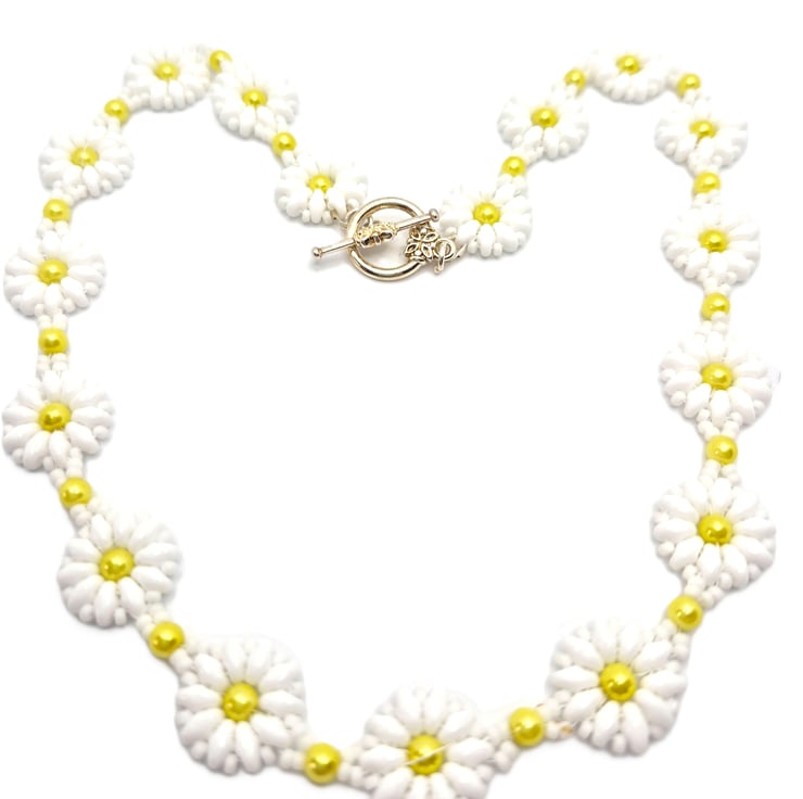 This is a beaded necklace from my "daisy collection". It is made with superduos, bright yellow faux pearls and white seed beads. It is finished with a silver coloured toggle clasp