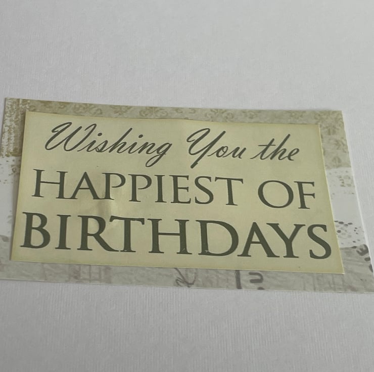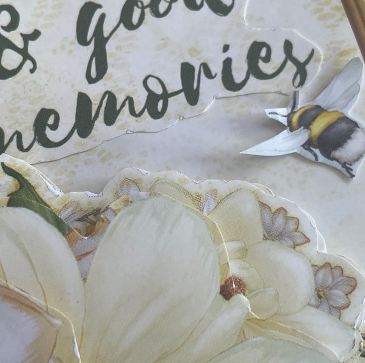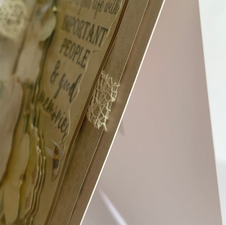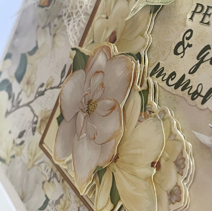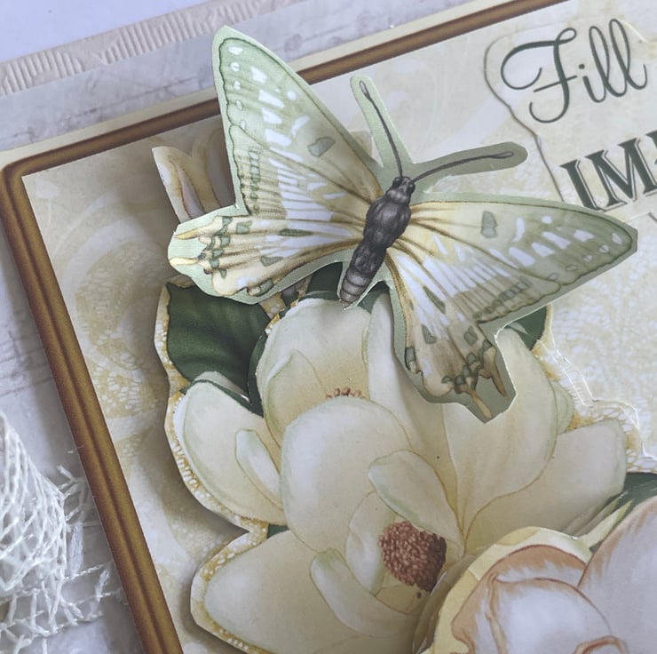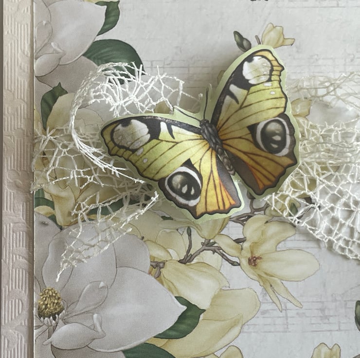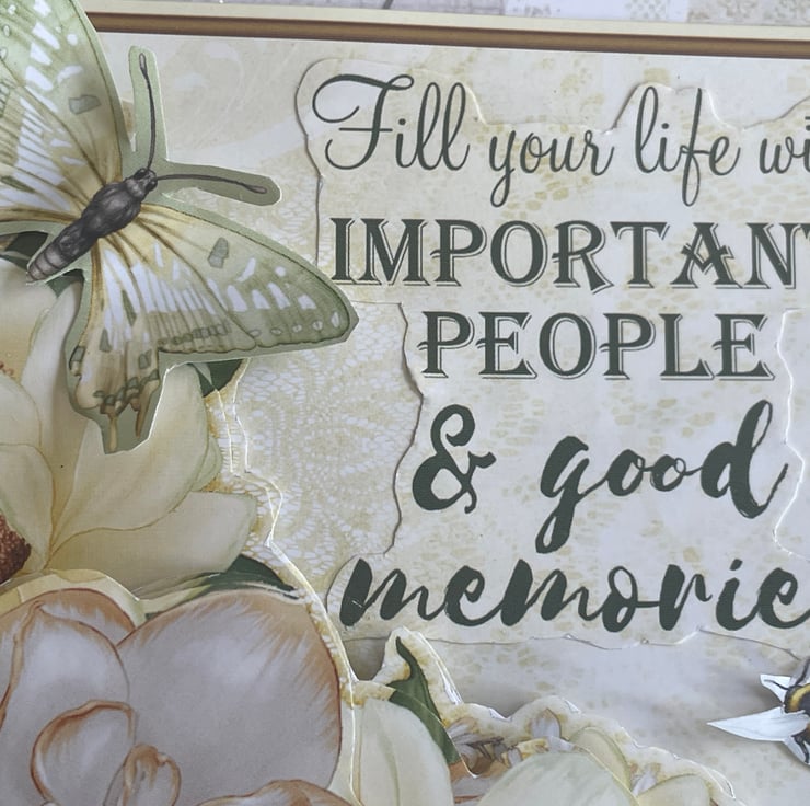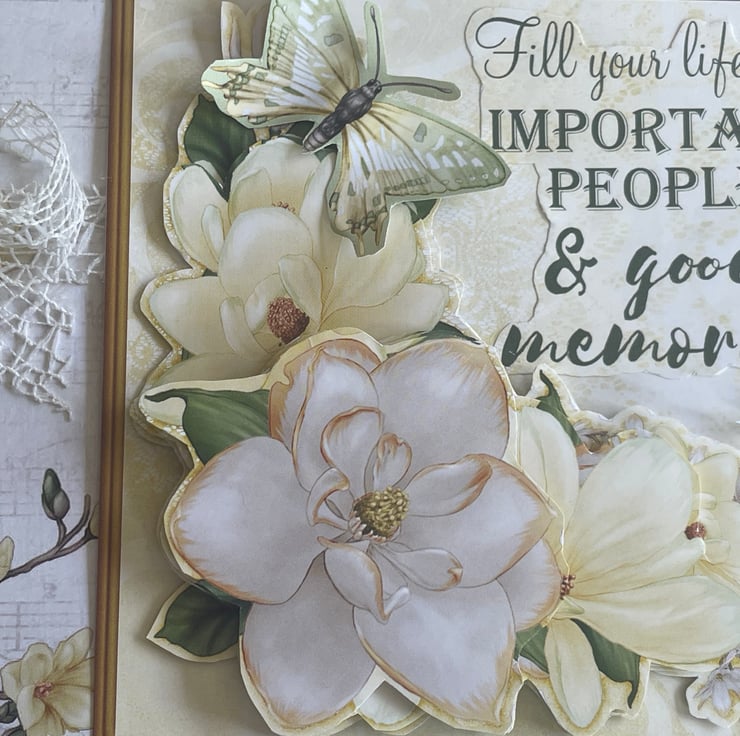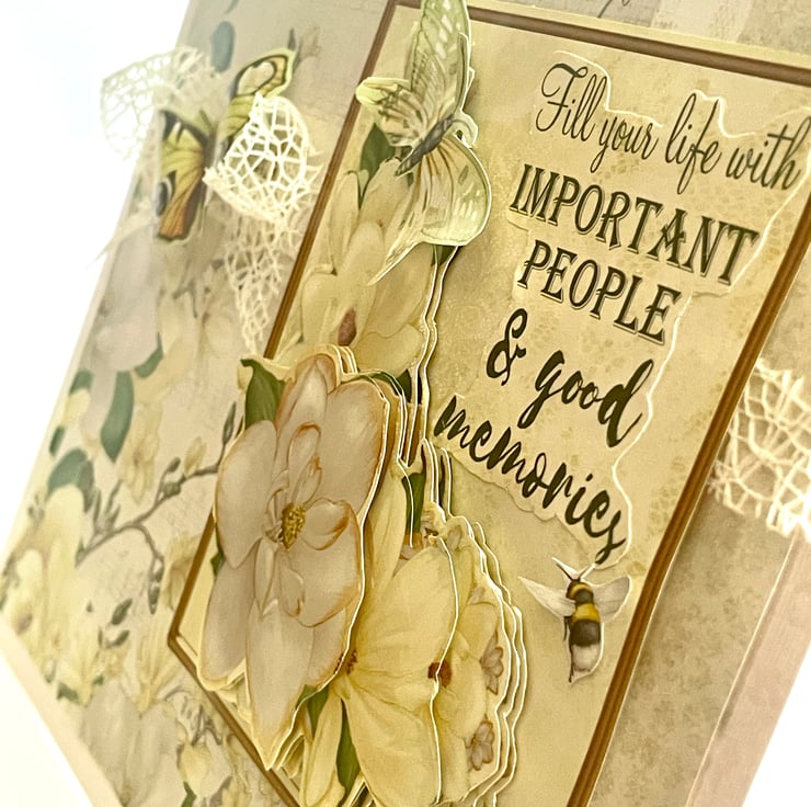 A beautiful floral card to celebrate a birthday. This A5 sized card is a riot of flowers. The background paper has a beautiful magnolia design enhanced with a printed lace border and pale green damask design. This is topped with some unique open weave ribbon and a bow and butterfly addition. The main design is another layered magnolia corner decoupage. This is enhanced with a butterfly and bumble bee. The greeting says Fill your life with important people and good memories. Inside the card has a matching greeting that says Wishing you the happiest of birthdays. The main card is a beautiful embossed cream scrolling leaf design in a cream pearl. A lovely way to say happy birthday.