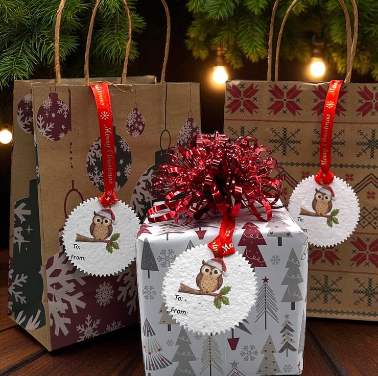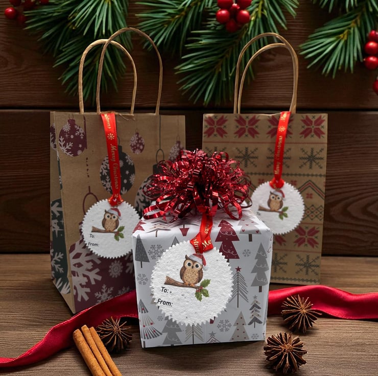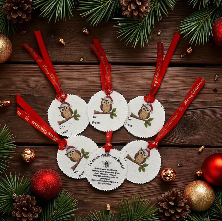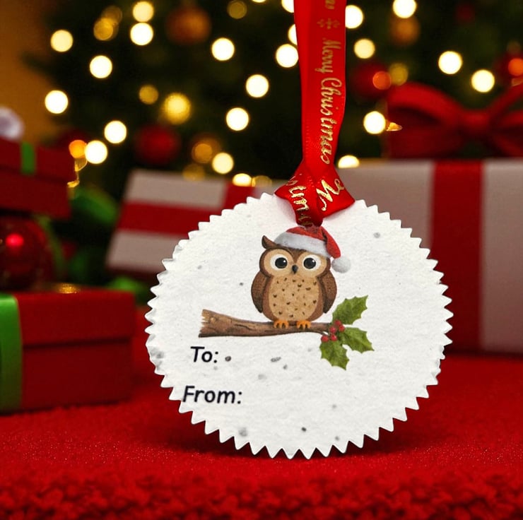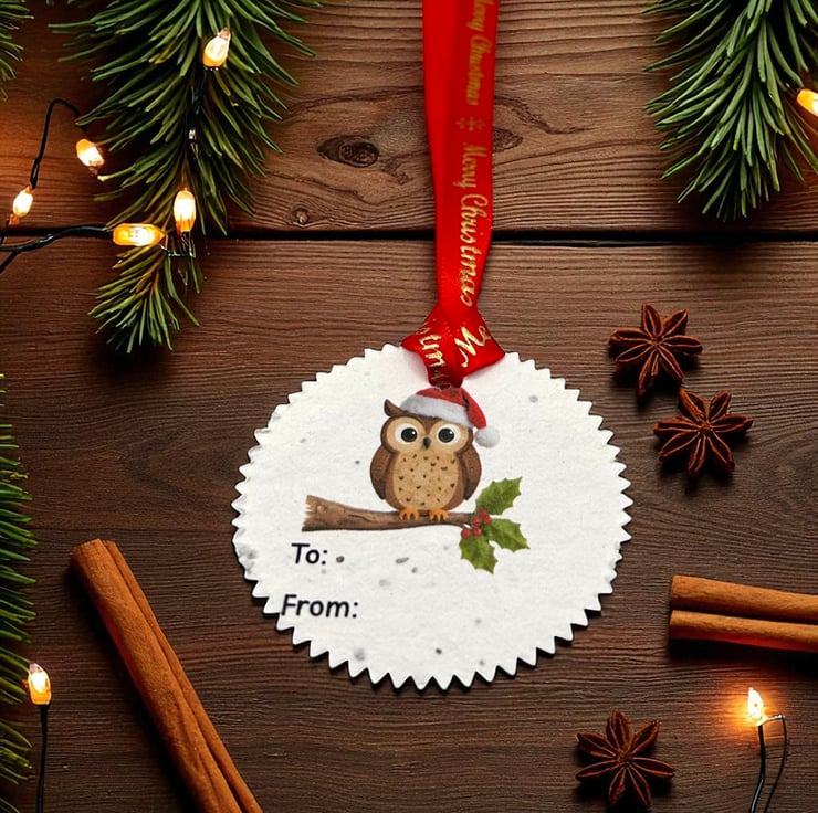 This set of six plantable Christmas gift tags is made from wildflower seed paper. Each circular tag measures approximately 6 cm in diameter and has serrated edges. The design features an illustrated owl perched on a holly branch with red berries. On the front is a “To:” and “From:” section for personalising your gifts.