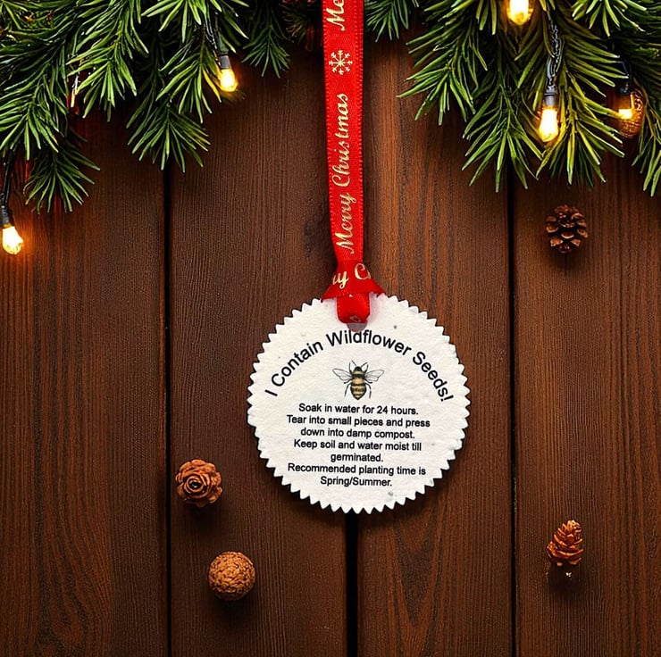 Each tag comes with a red ribbon printed with Merry Christmas in gold lettering. On the reverse side is a bee illustration with simple planting instructions: soak for 24 hours, tear into small pieces, press into damp compost, and keep soil moist until wildflowers appear.