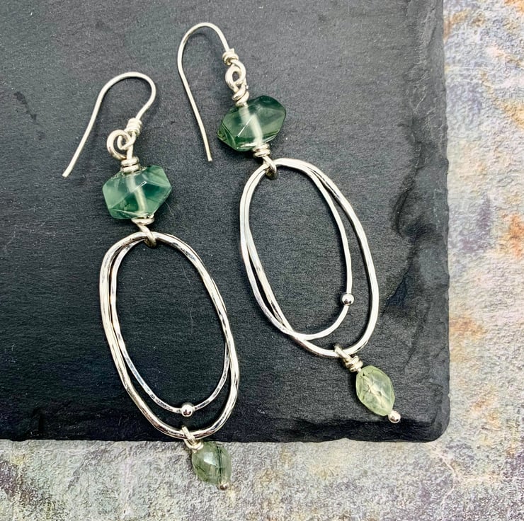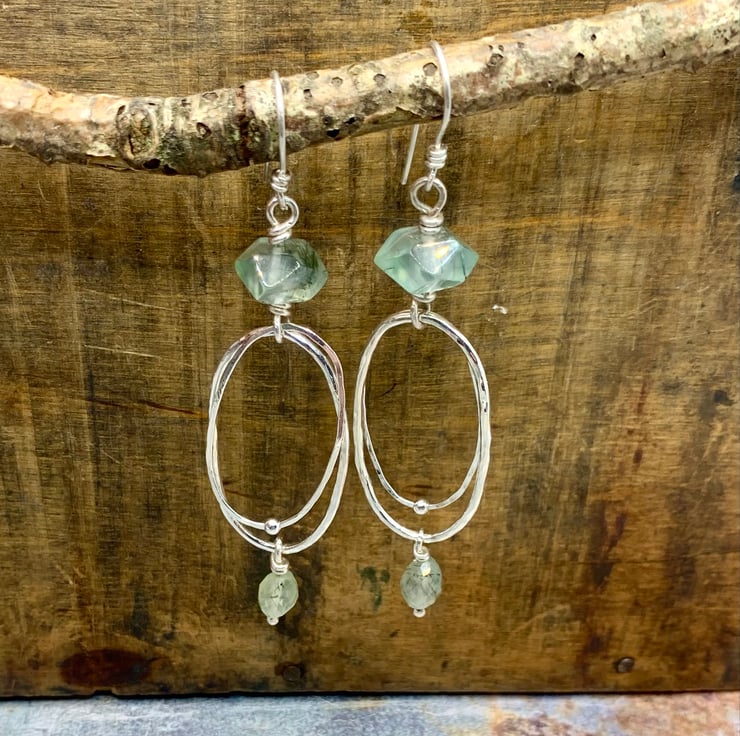 Handcrafted sterling silver earrings featuring two layers of textured oval hoops and prehnite beads. The earrings hang from silver earwires and measure approximately 8 cm in overall length.