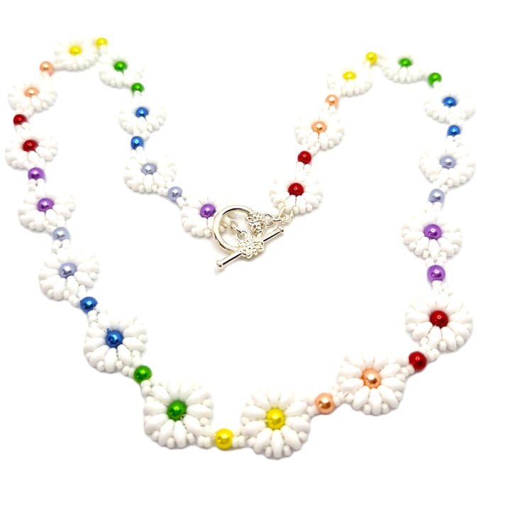 A longer length beaded necklace from my "daisy collection". It is made with white superduos, multi coloured faux pearls and white seed beads. It is finished with a silver coloured toggle clasp.