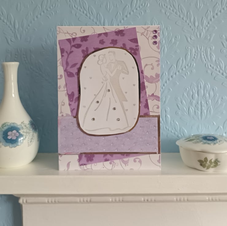 This pretty pastel card features a stamped and embossed image of a bride and groom dancing. This image is mounted on layers of lilac patterned papers and silver mirriboard. It is finished with lilac faux gemstones and would be ideal for a wedding.