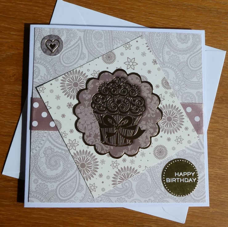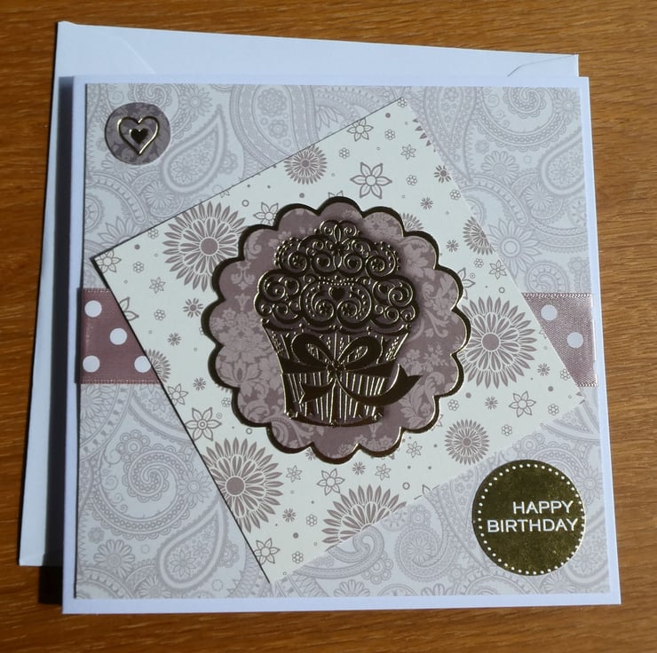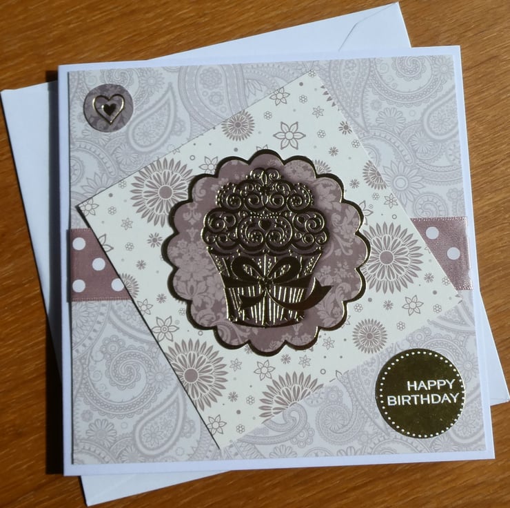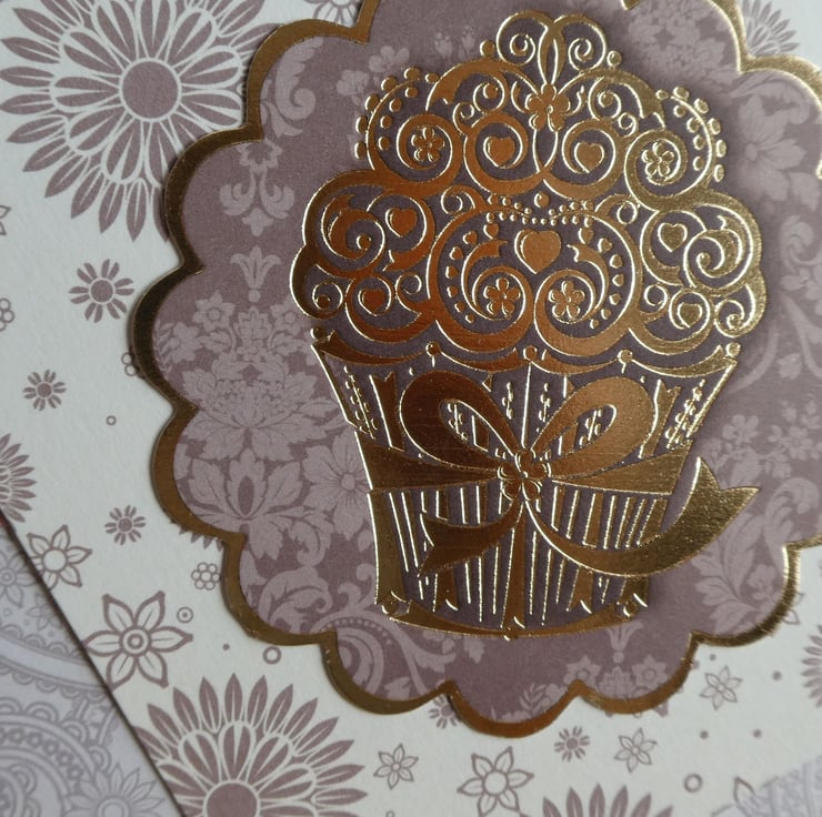 A central circular printed topper shows a lavishly decorated cupcake with gold foiled details in a case with a gold foiled bow. The image has been mounted onto layers of patterned card, with a cream layer patterned with a coffee abstract floral design offset onto a fawn and pale brown paisley patterned background which has been wrapped with a polka dot satin ribbon.