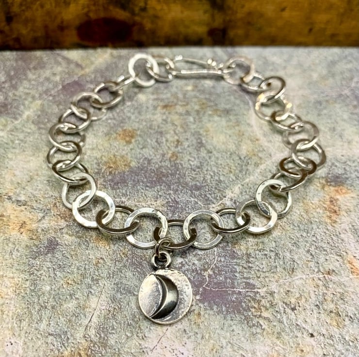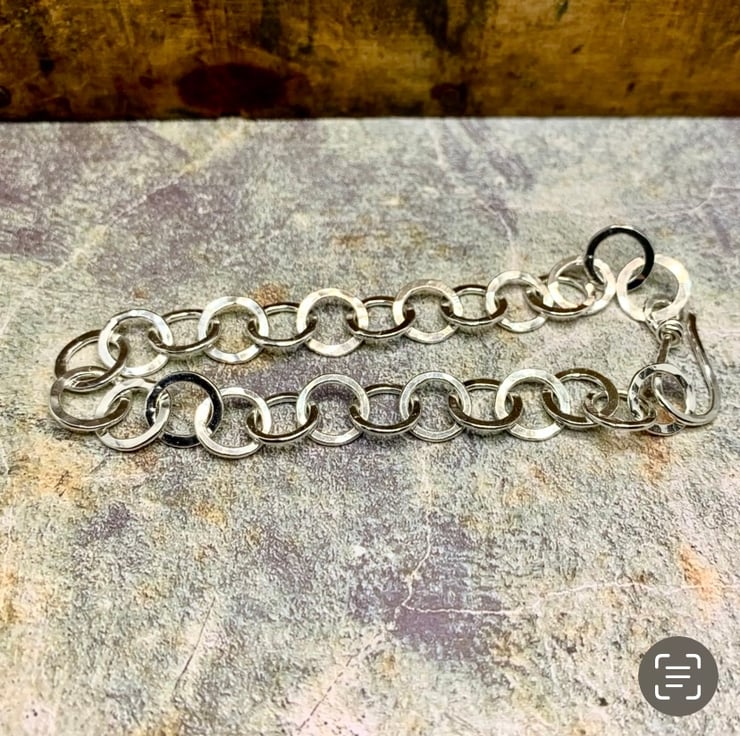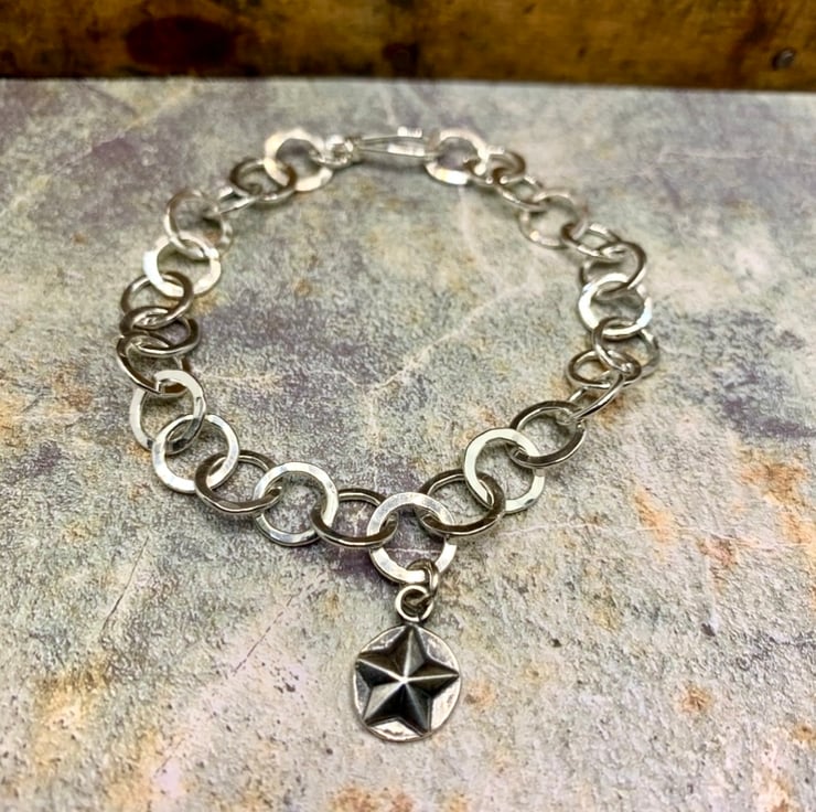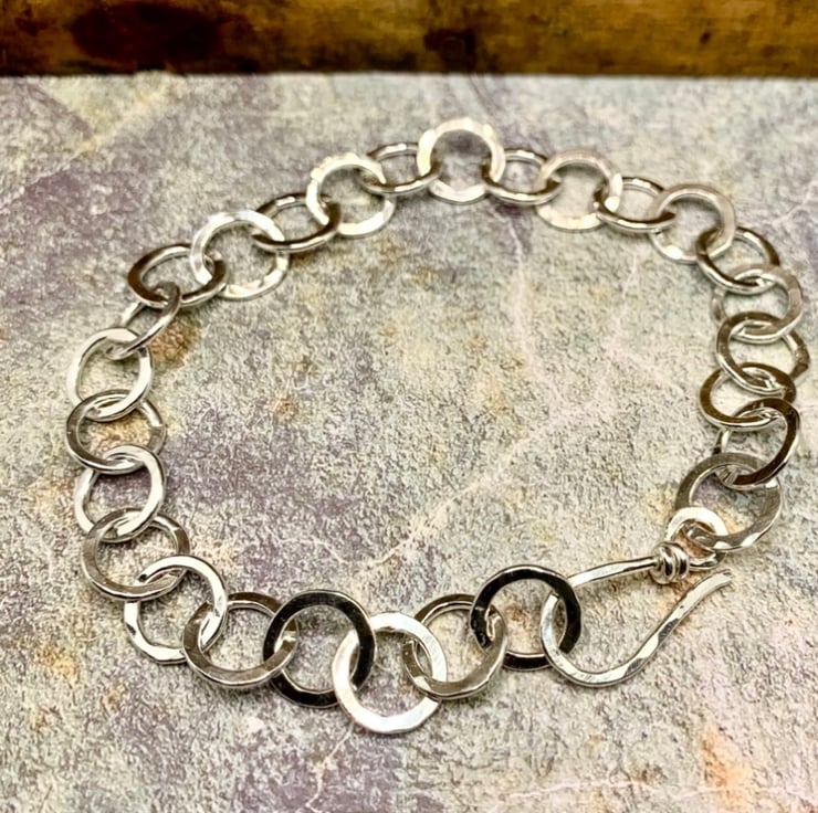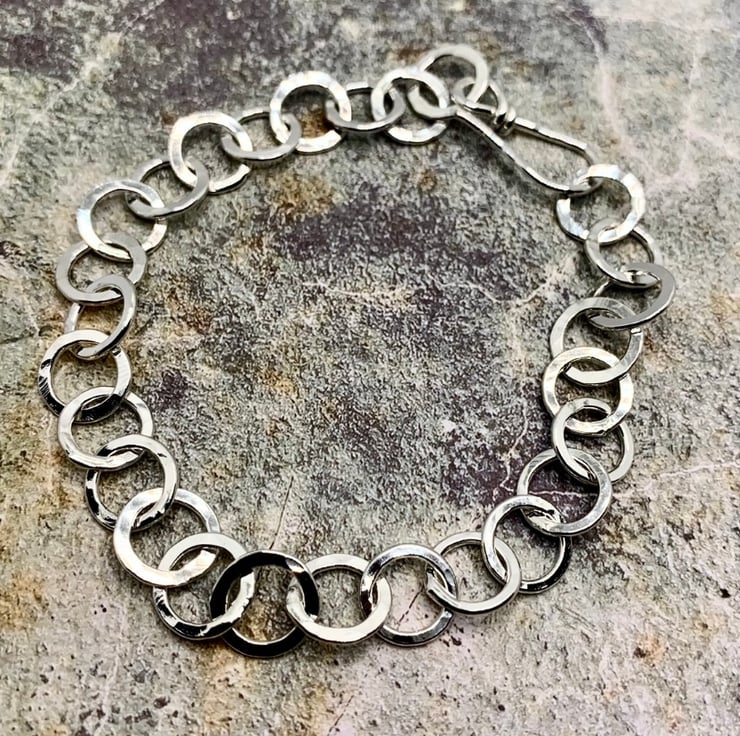 This is a handmade silver chain bracelet. Each ring has been hand-cut with a fine saw blade, which has then been given a dimpled texture before being soldered together. You can choose to purchase just the bracelet or add a charm to it. The textured rings beautifully catch the light, creating a stunning effect.
