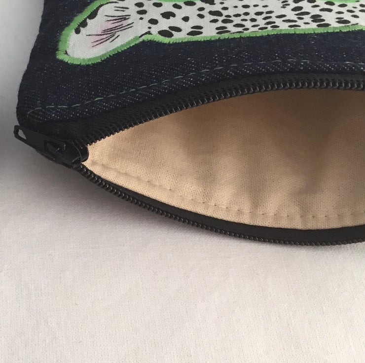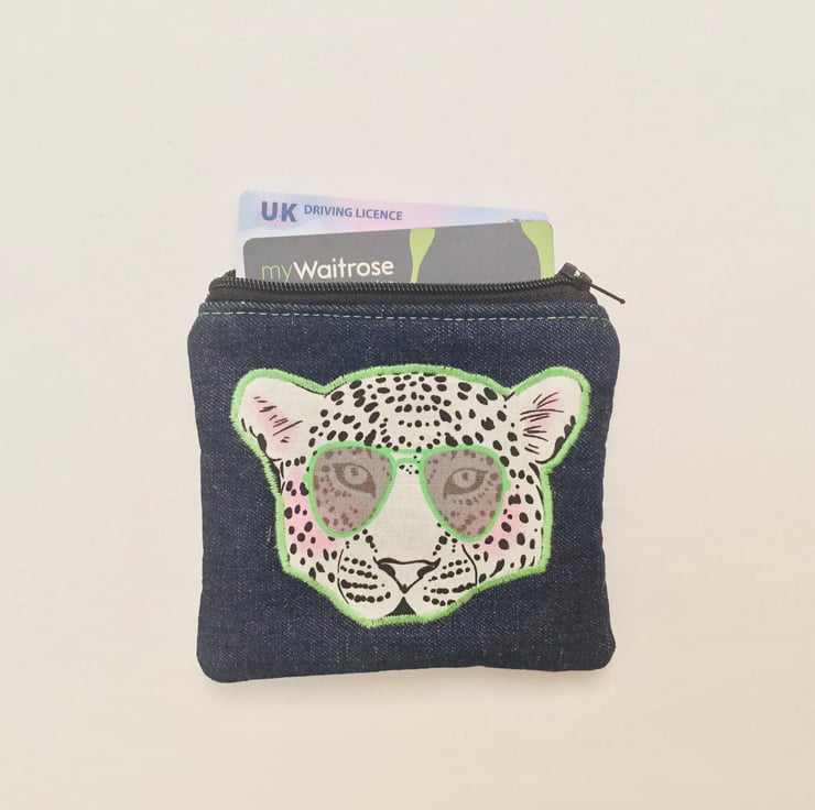 Small coin/card purse made from dark denim with an appliqued leopard in green sunglasses! Interfaced for softness and lined in a cream cotton fabric.