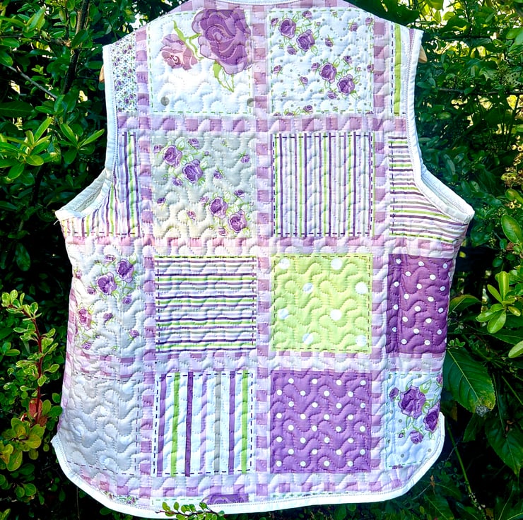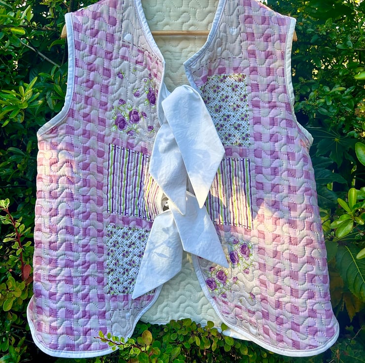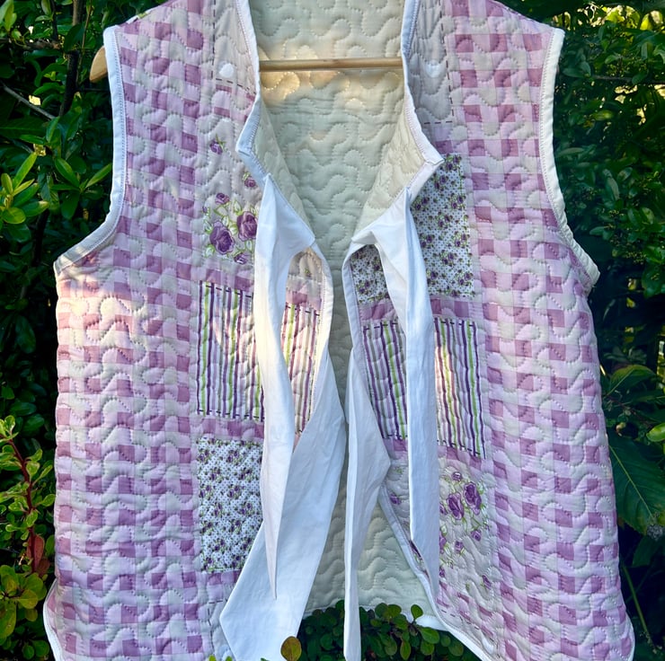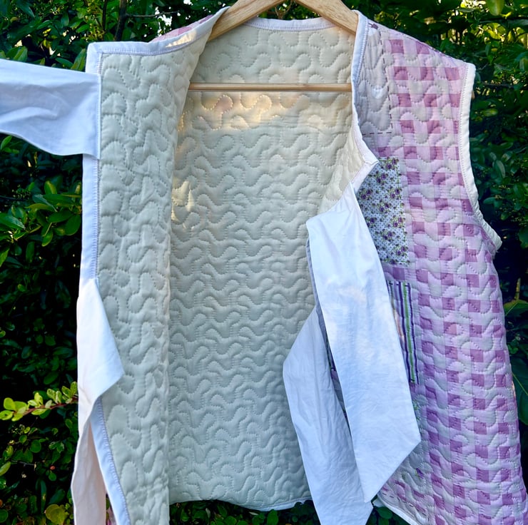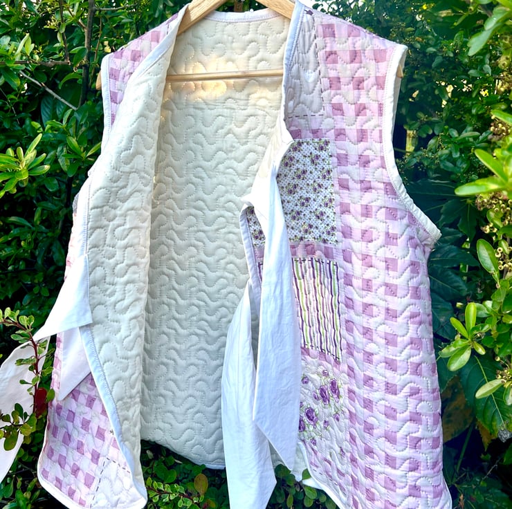 Patchwork patterned quilted waistcoat, upcycled from a preloved bed throw.