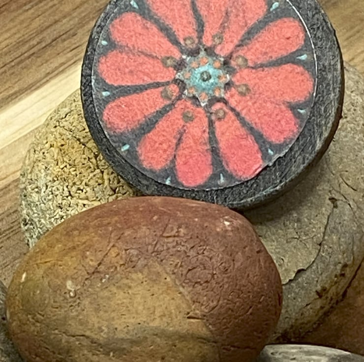 This piece is called Flower firework. It shows a petals exploding into the dark background. I then printed the design onto wooden transfer paper and next I hand painted the wooden disc with a black water colour. I varnish it before and after placing the wood transfer.