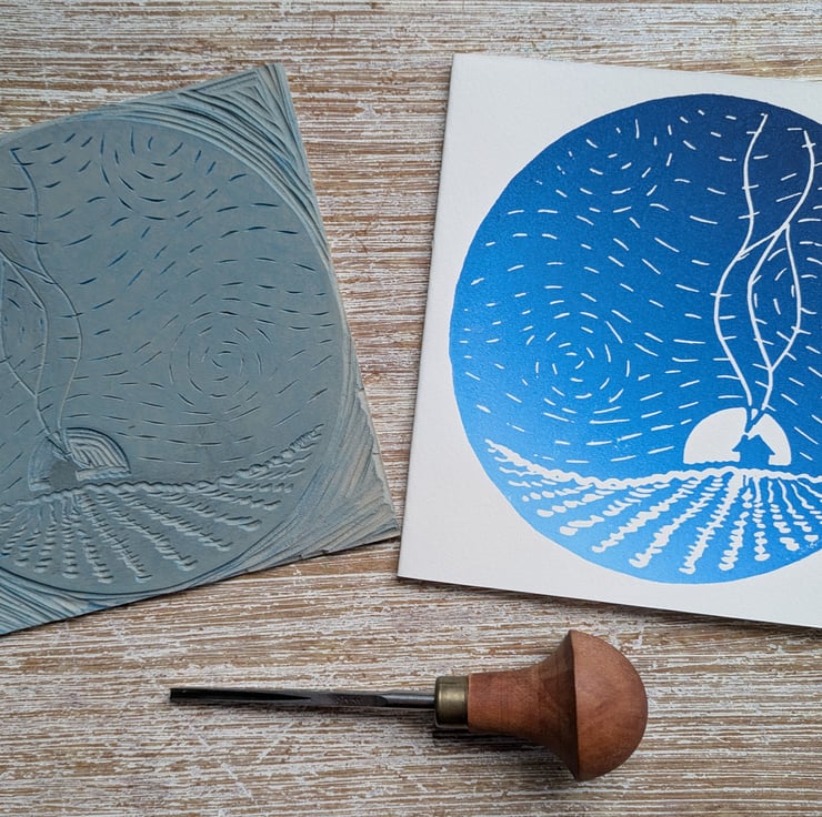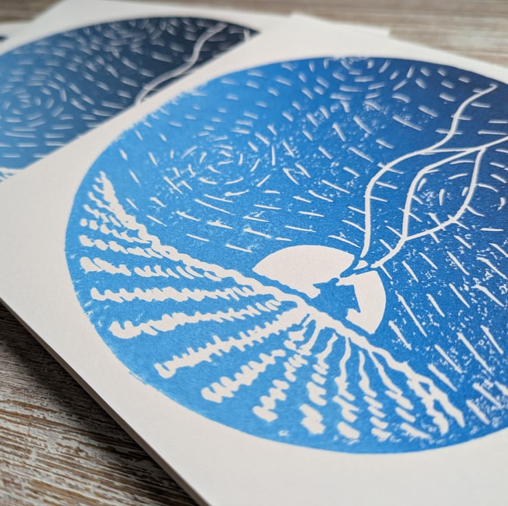 A cosy winter Christmas card, hand printed in a circular design on 14x14cm card. My design is a frozen field leading up to a cottage on the brow of a hill, with smoke rising from the chimney up into the snowy night. Each card is printed using waterbased inks in a blue glowing ombre. Comes with a cellophane bag and a white envelope.