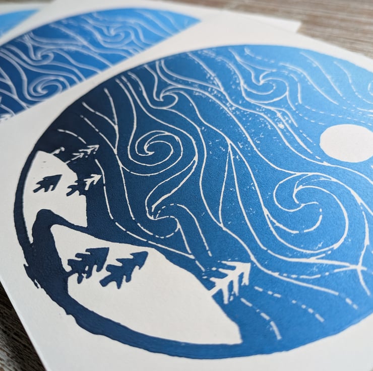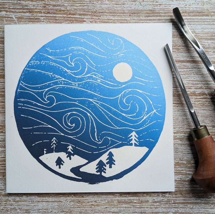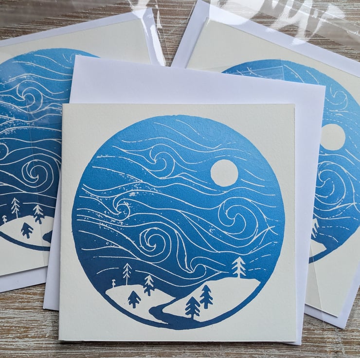 14cm square handprinted Christmas card, showing a swirling snow storm over a snow-covered landscape. It's printed in a light to dark blue ombre using waterbased inks. Each card is unique, with slightly different textures and imperfections which gives them personality! They come with a white envelope and cellophane bag.