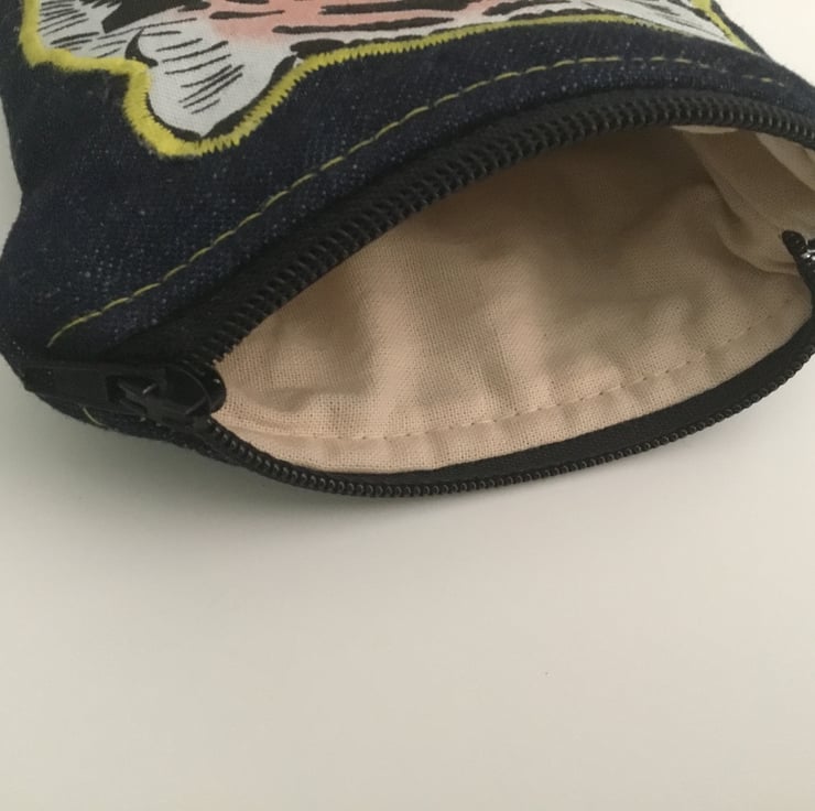 Small denim coin and card purse with an appliqued tiger in yellow glasses! Lined in a cream cotton fabric and interfaced for softness, a handy little purse that will fit in the smallest of bags. Measures 11cm x 11.5cm