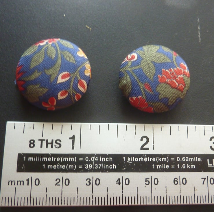 The fabric used for these gorgeous silk buttons was gleened form a vintage silk tie and were handmade by me, I am selling these as a set of 5. This is a delicate intricate design of colourful intertwines flowers on a dark blue background.