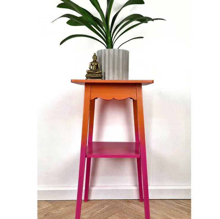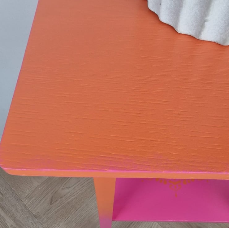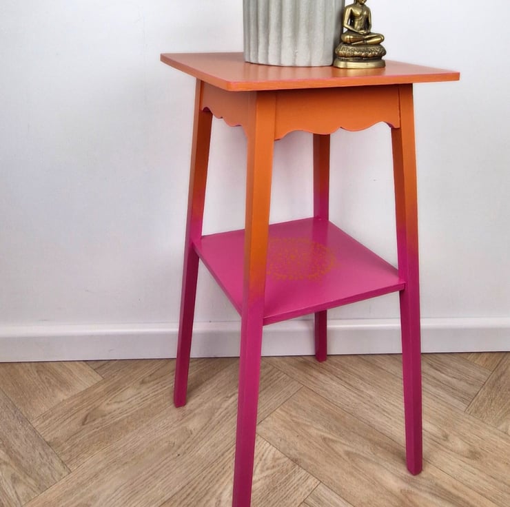 The orange blends beautifully into the pink, whilst the additional lower shelf has added detailing of a mandala stencil. The edges of the top have been highlighted with the pink.