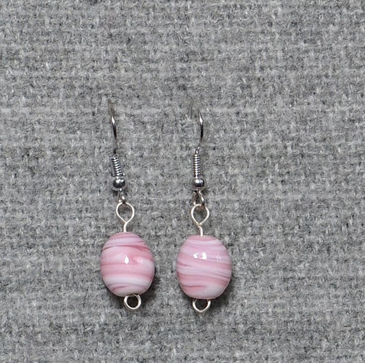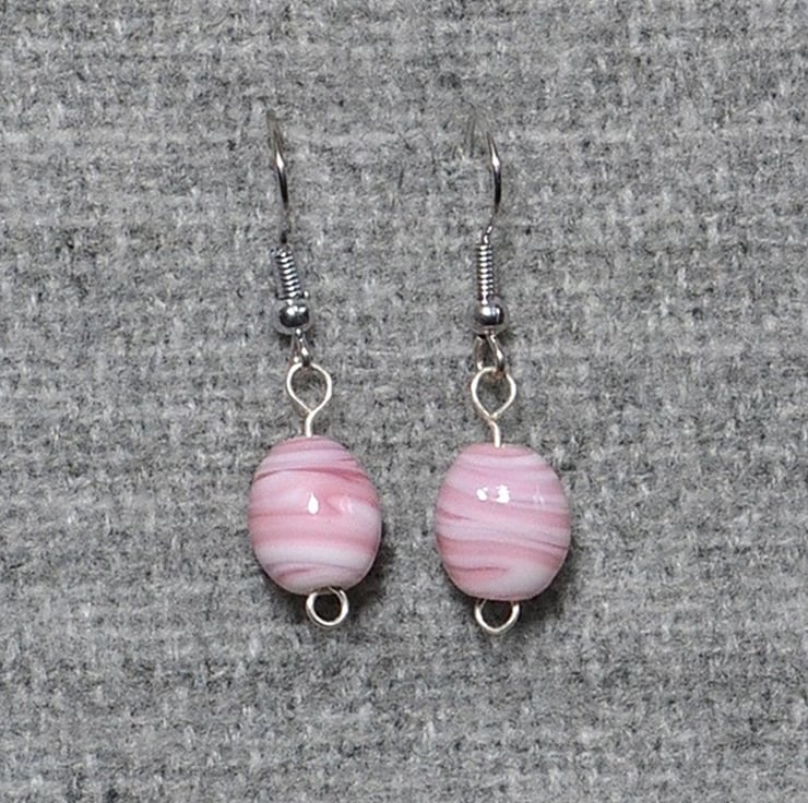 Simple and elegant pink and white swirled glass beads on silver-plated ear wires. These earrings hang 2.5cm, or 1 inch, and are quite lightweight.